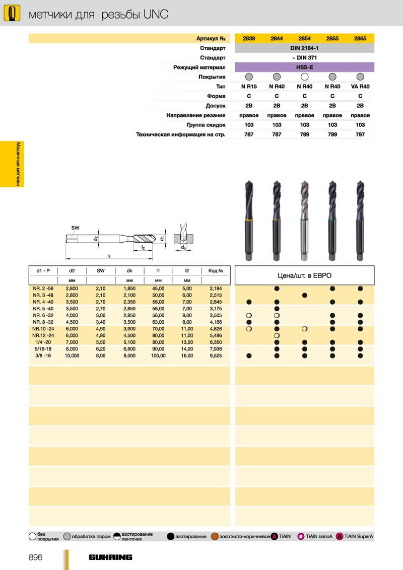 Р метчики для резьбы UNC Артикул Ns 2839 2844 2854 2855 2865 Стандарт DIN 2184-1 Стандарт ~ DIN 371 Режущий материал HSS-E Покрытие О О О О О Тип N R15 N R40 N R40 N R 40 VAR40 Форма С С С С С Допуск 2В 2В 2В 2В 2В Направление резания правое правое правое правое правое Группа скидок 103 103 103 103 103 Техническая информация на стр. 787 787 799 799 797 Машинные метчики i 1 f 1 и SW / --- \ i I II I - d1 - Р d2 SW dk I2 '1 Код № Ц е н а/ш т . в Е В Р О MM MM MM MM NR. 2 -56 2,800 2,10 1,850 45,00 5,00 2,184 • • • NR. 3 -48 2,800 2,10 2,100 50,00 6,00 2,515 • NR. 4 -40 3,500 2,70 2,350 56,00 7,00 2,845 • • • • NR. 5 -40 3,500 2,70 2,650 56,00 7,00 3,175 • NR. 6 -32 4,000 3,00 2,850 56,00 8,00 3,505 О о • • NR. 8 -32 4,500 3,40 3,500 63,00 8,00 4,166 • • • • NR.10-24 6,000 4,90 3,900 70,00 11,00 4,826 о • о • • NR.12-24 6,000 4,90 4,500 80,00 11,00 5,486 о 1/4 -20 7,000 5,50 5,100 80,00 13,00 6,350 • • • • 5/16-18 8,000 6,20 6,600 90,00 14,00 7,938 • • • • 3/8-16 10,000 8,00 8,000 100,00 16,00 9,525 • • • • • С) покрытия О обработка паром © НИе ^^азотирование (^) золотисто-коричневое^^ TiAIN Q TiAIN nanoA (A) TiAIN SuperA 896 E U H B IN E