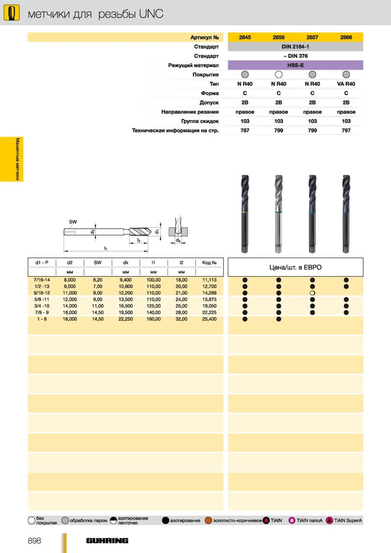 Р метчики для резьбы UNC Артикул Ns 2845 2856 2857 2866 Стандарт DIN 2184-1 Стандарт ~ DIN 376 Режущий материал HSS-E Покрытие О О О О Тип N R40 N R40 N R40 VAR40 Форма С С С С Допуск 2В 2В 2В 2В Направление резания правое правое правое правое Группа скидок 103 103 103 103 Техническая информация на стр. 787 799 799 797 Машинные метчики SW / ( ' I OJ ( | "О С ^ I2 ^ ~ г ll d1 - Р d2 SW dk I2 '1 Код № Ц е н а/ш т . в Е В Р О М М М М М М М М 7/16-14 8,000 6,20 9,400 100,00 18,00 11,113 1/2-13 9,000 7,00 10,800 110,00 20,00 12,700 9/16-12 11,000 9,00 12,200 110,00 21,00 14,288 О 5/8 -11 12,000 9,00 13,500 110,00 24,00 15,875 3/4-10 14,000 11,00 16,500 125,00 25,00 19,050 7/ 8-9 18,000 14,50 19,500 140,00 28,00 22,225 1 - 8 18,000 14,50 22,250 160,00 32,00 25,400 С) покрытия О обработка паром © НИе ^^азотирование золотисто-коричневое 1^1 TiAIN Q TiAIN nanoA (A) TiAIN SuperA 898 E U H B IN E