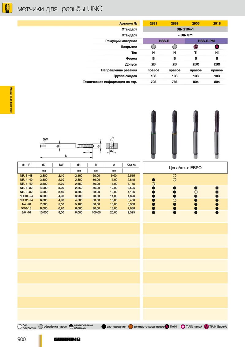 Р метчики для резьбы UNC Артикул Ns 2881 2889 2905 2918 Стандарт DIN 2184-1 Стандарт - DIN 371 Режущий материал HSS-E HSS-E-PM Покрытие О О • О Тип N N Ti Ni Форма В В В В Допуск 2В 2В 2ВХ 2ВХ Направление резания правое правое правое правое Группа скидок 103 103 103 103 Техническая информация на стр. 798 786 804 804 Машинные метчики | I 1 1 - 1 Г d1 - Р d2 SW dk 11 I2 Код № Ц е н а/ш т . в Е В Р О М М М М М М М М NR. 3 -48 2,800 2,10 2,100 50,00 9,00 2,515 О NR. 4 -40 3,500 2,70 2,350 56,00 11,00 2,845 о NR. 5 -40 3,500 2,70 2,650 56,00 11,00 3,175 О NR. 6 -32 4,000 3,00 2,850 56,00 12,00 3,505 • • • • NR. 8 -32 4,500 3,40 3,500 63,00 13,00 4,166 • • о • NR.10-24 6,000 4,90 3,900 70,00 14,00 4,826 • • • • NR.12-24 6,000 4,90 4,500 80,00 16,00 5,486 • О • • 1/4 -20 7,000 5,50 5,100 80,00 16,00 6,350 • • • • 5/16-18 8,000 6,20 6,600 90,00 18,00 7,938 • • • • 3/8-16 10,000 8,00 8,000 100,00 20,00 9,525 • • • • С) покрытия О обработка паром © НИе ^^азотирование золотисто-коричневое 1^1 TiAIN Q TiAIN nanoA (A) TiAIN SuperA 900 GUH HING