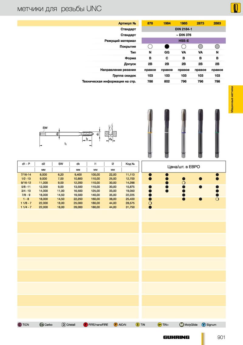 метчики для резьбы UNC Артикул Ns 878 1984 1985 2873 2883 Стандарт DIN 2184-1 Стандарт ~ DIN 376 Режущий материал HSS-E Покрытие О • О О О Тип N GG VA VA N Форма В С В В В Допуск 2В 2В 2В 2В 2В Направление резания правое правое правое правое правое Группа скидок 103 103 103 103 103 Техническая информация на стр. 786 802 796 796 798 Машинные метчики d1 - Р d2 SW dk I2 '1 Код № Ц е н а/ш т . в Е В Р О М М М М М М М М 7/16-14 8,000 6,20 9,400 100,00 22,00 11,113 1/2-13 9,000 7,00 10,800 110,00 25,00 12,700 9/16-12 11,000 9,00 12,200 110,00 30,00 14,288 О 5/8 -11 12,000 9,00 13,500 110,00 30,00 15,875 3/4-10 14,000 11,00 16,500 125,00 33,00 19,050 7/ 8-9 18,000 14,50 19,500 140,00 35,00 22,225 1 - 8 18,000 14,50 22,250 160,00 38,00 25,400 о 1 1 / 8- 7 22,000 18,00 25,000 180,00 44,00 28,575 О 1 1 / 4- 7 22,000 18,00 28,000 180,00 44,00 31,750 © TiCN @ Carbo © C r is ta ll ф FIRE/nanoFIRE (?) AlCrN (§) TiN @ TiN+ MolyGlide © ) Signum