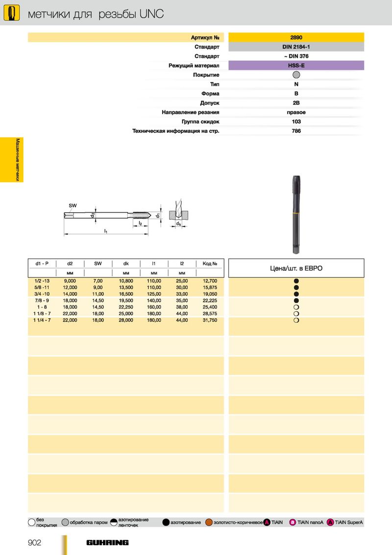 Р метчики для резьбы UNC Артикул Ns 2890 Стандарт DIN 2184-1 Стандарт ~ DIN 376 Режущий материал HSS-E Покрытие О Тип N Форма В Допуск 2В Направление резания правое Группа скидок 103 Техническая информация на стр. 786 Машинные метчики d1 - Р d2 SW dk I2 '1 Код № Ц е н а/ш т . в Е В Р О М М М М М М М М 1/2-13 9,000 7,00 10,800 110,00 25,00 12,700 5/8 -11 12,000 9,00 13,500 110,00 30,00 15,875 3/4-10 14,000 11,00 16,500 125,00 33,00 19,050 7/ 8-9 18,000 14,50 19,500 140,00 35,00 22,225 1 - 8 18,000 14,50 22,250 160,00 38,00 25,400 О 1 1 / 8- 7 22,000 18,00 25,000 180,00 44,00 28,575 О 1 1 / 4- 7 22,000 18,00 28,000 180,00 44,00 31,750 о без азотирование О азотирование О золотисто-коричневое 1^1 TiAIN Q TiAIN nanoA (A) TiAIN SuperA покрытия О обработка паром © ленточек 902 GUH HING