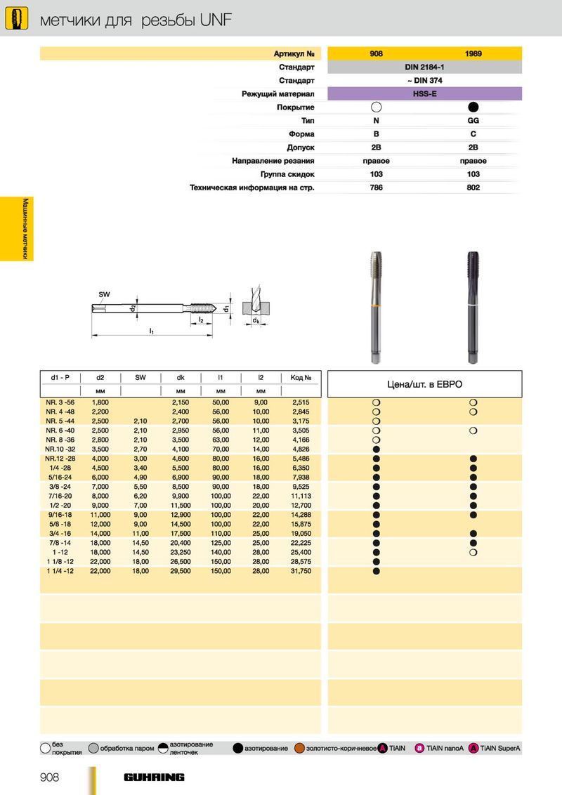 Р метчики для резьбы UNF Артикул Ns 908 1989 Стандарт DIN 2184-1 Стандарт ~ DIN 374 Режущий материал HSS-E Покрытие О • Тип N GG Форма В С Допуск 2В 2В Направление резания правое правое Группа скидок 103 103 Техническая информация на стр. 786 802 Машинные метчики d1 - Р d2 SW dk I2 '1 Код № Ц е н а/ш т . в Е В Р О М М М М М М М М NR. 3 -56 1,800 2,150 50,00 9,00 2,515 О о NR. 4 -48 2,200 2,400 56,00 10,00 2,845 О о NR. 5 -44 2,500 2,10 2,700 56,00 10,00 3,175 о NR. 6 -40 2,500 2,10 2,950 56,00 11,00 3,505 о о NR. 8 -36 2,800 2,10 3,500 63,00 12,00 4,166 о NR.10-32 3,500 2,70 4,100 70,00 14,00 4,826 NR.12-28 4,000 3,00 4,600 80,00 16,00 5,486 1/4 -28 4,500 3,40 5,500 80,00 16,00 6,350 5/16-24 6,000 4,90 6,900 90,00 18,00 7,938 3/8 -24 7,000 5,50 8,500 90,00 18,00 9,525 7/16-20 8,000 6,20 9,900 100,00 22,00 11,113 1/2 -20 9,000 7,00 11,500 100,00 20,00 12,700 9/16-18 11,000 9,00 12,900 100,00 22,00 14,288 5/8-18 12,000 9,00 14,500 100,00 22,00 15,875 3/4-16 14,000 11,00 17,500 110,00 25,00 19,050 7/8-14 18,000 14,50 20,400 125,00 25,00 22,225 1 -12 18,000 14,50 23,250 140,00 28,00 25,400 о 1 1/8-12 22,000 18,00 26,500 150,00 28,00 28,575 1 1/4-12 22,000 18,00 29,500 150,00 28,00 31,750 без азотирование О обработка паром азотирование О золотисто-коричневое 1^1 TiAIN Q TiAIN nanoA (A) TiAIN SuperA покрытия О © ленточек 908 GUH HING