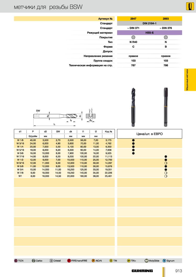 метчики для резьбы BSW Артикул № 2847 2893 Стандарт DIN 2184-1 Стандарт ~ DIN 371 - DIN 376 Режущий материал HSS-E Покрытие О О Тип N R40 N Форма С В Допуск Направление резания правое правое Группа скидок 103 103 Техническая информация на стр. 787 786 Машинные метчики SW d1 d2 SW dk I2 Р 11 Код № Ц е н а/ш т . в Е В Р О G/дюйм М М М М М М М М W 1/8 40,00 3,500 2,70 2,500 56,00 7,00 3,175 W 3/16 24,00 6,000 4,90 3,600 70,00 11,00 4,762 W 1/4 20,00 7,000 5,50 5,100 80,00 13,00 6,350 W 5/16 18,00 8,000 6,20 6,500 90,00 14,00 7,938 W 3/8 16,00 10,000 8,00 7,900 100,00 16,00 9,525 W 7/16 14,00 8,000 6,20 9,200 100,00 22,00 11,113 W 1/2 12,00 9,000 7,00 10,500 110,00 25,00 12,700 W 9/16 12,00 11,000 9,00 12,000 110,00 30,00 14,287 О W 5/8 11,00 12,000 9,00 13,500 110,00 30,00 15,876 W 3/4 10,00 14,000 11,00 16,250 125,00 33,00 19,051 W 7/8 9,00 18,000 14,50 19,250 140,00 35,00 22,226 О W1 8,00 18,000 14,50 22,000 160,00 38,00 25,401 О © TiCN @ Carbo © C r is ta ll ф FIRE/nanoFIRE (?) AlCrN (§) TiN @ TiN+ MolyGlide © ) Signum