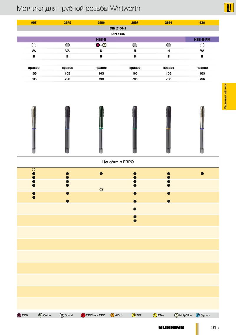 Метчики для трубной резьбы Whitworth 967 2875 2886 2887 2894 938 DIN 2184-1 DIN 5156 HSS-E HSS-E-PM О О © + © О О О VA VA N N N VA В В В В В В правое правое правое правое правое правое 103 103 103 103 103 103 796 796 798 798 786 796 Машинные метчики Ц е н а/ш т . в Е В Р О О • • • • • • • • • • ® T iC N @ C a rb o (Б) Cristall ф FIRE/nanoFIRE (?) AlCrN (S) TiN @ T iN + 0 M o ly G lid e ® S ig n u m 919