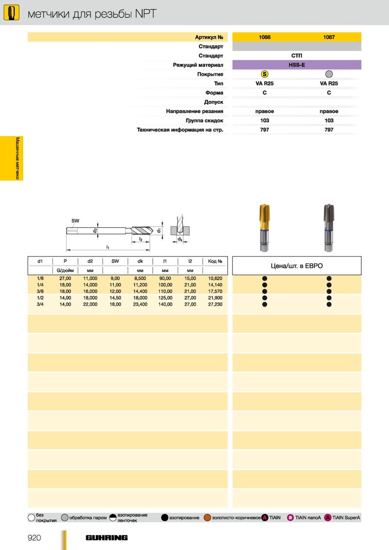 метчики для резьбы NPT Артикул № 1088 1087 Стандарт Стандарт СТП Режущий материал HSS-E Покрытие ® О Тип VAR25 VAR25 Форма С С Допуск Направление резания правое правое Группа скидок 103 103 Техническая информация на стр. 797 797 Машинные метчики Ц е н а/ш т . в Е В Р О • • • • • • 1/2 14,00 18,000 14,50 18,000 125,00 27,00 21,900 3/4 14,00 22,000 18,00 23,400 140,00 27,00 27,230 без азотирование О обработка паром покрытия О © азотирование О золотисто-коричневое 1^1 TiAIN Q TiAIN nanoA (A) TiAIN SuperA ленточек 920 GUH HING