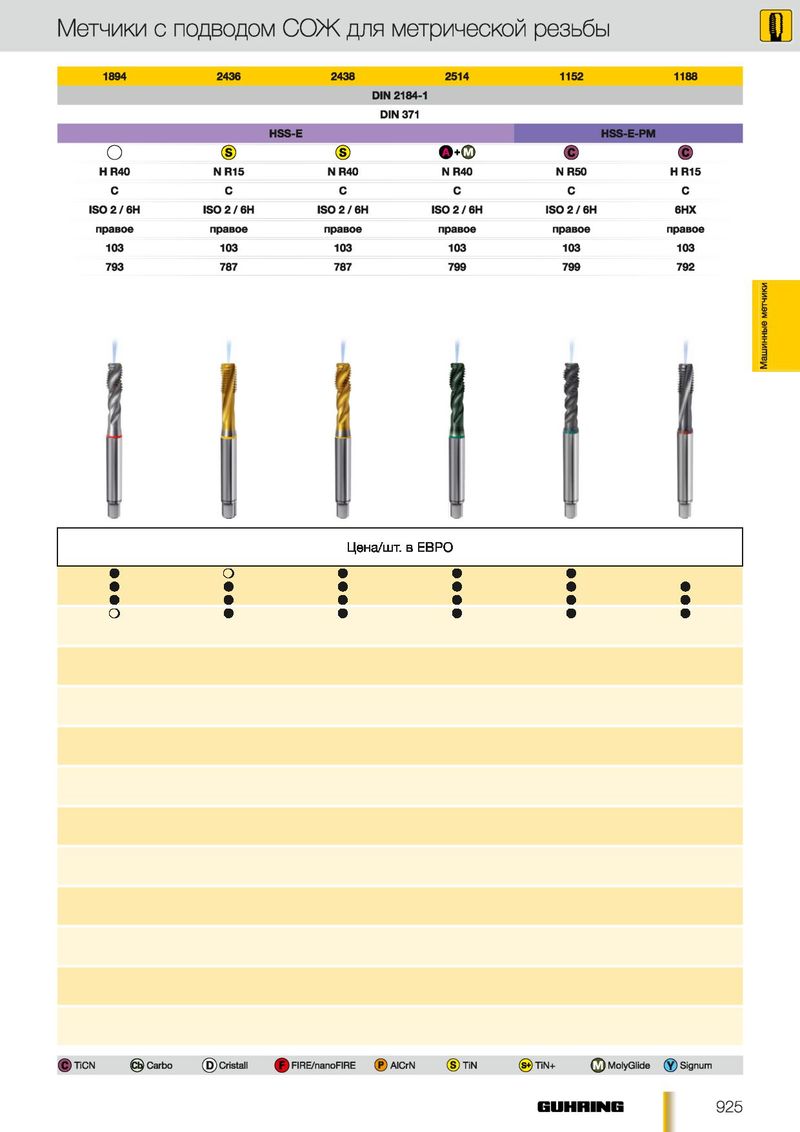 Метчики с подводом СО Ж для метрической резьбы 1894 2436 2438 2514 1152 1188 DIN 2184-1 DIN 371 HSS-E HSS-E-PM О О + ф ® ® • • H R 40 N R 15 N R40 N R40 N R50 Н R15 С С С С С С IS 0 2 /6 H IS 0 2 /6 H ISO 2 / 6Н ISO 2 / 6Н ISO 2 / 6Н 6НХ правое правое правое правое правое правое 103 103 103 103 103 103 793 787 787 799 799 792 Машинные метчики ® T iC N @ Carbo (Б) Cristall ф FIRE/nanoFIRE (?) AlCrN (§) TiN @ T iN + 0 M o ly G lid e ® S ig n u m 925