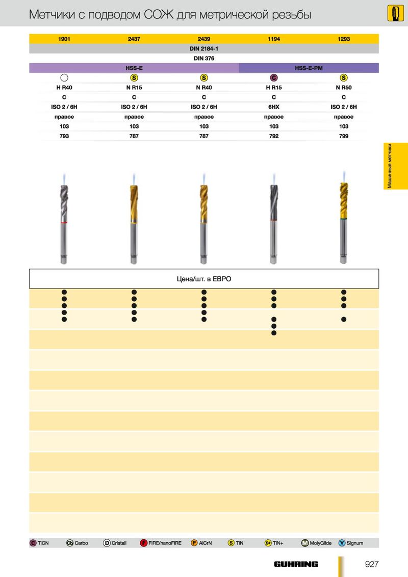 Метчики с подводом СО Ж для метрической резьбы 1901 2437 2439 1194 1293 DIN 2184-1 DIN 376 HSS-E HSS-E-PM О ® ® • ® H R40 N R15 N R40 Н R15 N R50 С С С С С IS 0 2 /6 H IS 0 2 /6 H ISO 2 / 6Н 6НХ IS 0 2 /6 H правое правое правое правое правое 103 103 103 103 103 793 787 787 792 799 Машинные метчики I Ц е н а/ш т . в Е В Р О ф TiCN @ Carbo (Б) Cristall ф FIRE/nanoFIRE (?) AlCrN (§) TiN @ TiN+ MolyGlide ( J ) Signum