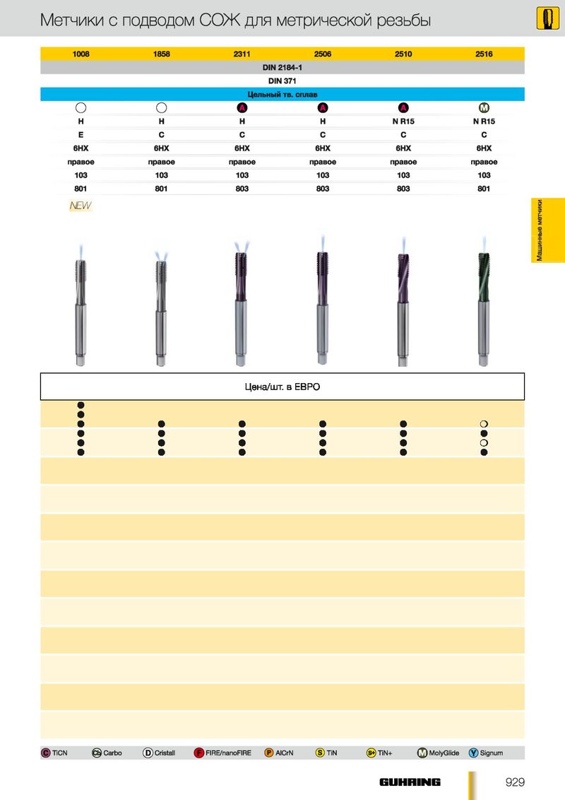 Метчики с подводом СО Ж для метрической резьбы 1008 1858 2311 2506 2510 2516 DIN 2184-1 DIN 371 Цельный тв. сплав О О О О О (J ) Н Н н Н N R15 N R15 Е С с С С С 6НХ 6НХ 6НХ 6НХ 6НХ 6НХ правое правое правое правое правое правое 103 103 103 103 103 103 801 801 803 803 803 801 N E W Машинные метчики ф TiCN @ Carbo (Б) Cristall ф FIRE/nanoFIRE (?) AlCrN (§) TiN @ TiN+ MolyGlide ( J ) Signum