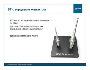BT с торцевым контактом BT 30 и BT 40 термопатроны с контактом по торцу Доступно с октября 2020 года, уже включены в новый общий каталог Цены в новом прайс-листе © Haimer GmbH 2020, Quality „100 % made in Germany“