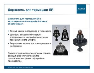 Держатель для термоцанг ER Держатель для термоцанг ER с интегрированной настройкой длины обеспечивает: Точный зажим инструмента в термоцанге Быструю, с высокой точностью повторяемости, настройку вылета при помощи упорного штифта Регулировка вылета при помощи винта и контрагайки Подходит для многошпиндельных станков, для одинаково точного зажима однотипного инструмента (серийное производство) © Haimer GmbH 2020, Quality „100 % made in Germany“