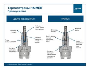 Термопатроны HAIMER Преимущества HAIMER Другие производители Короткая посадка Плохо пропускает СОЖ Доступ к шестиграннику закрыт © Haimer GmbH 2020, Quality „100 % made in Germany“ Большая длина фаски (нет зажима) Широкое отверстие = захват слабее Длинная посадка Болт с лыской: хорошо пропускает СОЖ Доступ к одному из шестигранных пазов всегда возможен Короткая фаска Узкое отверстие – хорошая сила зажима