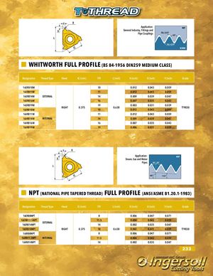 Y R Application: NUT X General Industry, Fittings and Pipe Couplings L IC SCREW WHITWORTH FULL PROFILE (BS 84-1956 DIN259 MEDIUM CLASS) Designation Thread Type Hand IC (inch) TPI L (inch) R (inch) X (inch) Y (inch) Grade 16ERB10W 10 0.012 0.043 0.059 16ERB11W 11 0.012 0.043 0.059 16ERB14W EXTERNAL 14 0.009 0.039 0.047 16ERB16W 16 0.007 0.035 0.043 16ERB19W 19 0.003 0.031 0.039 RIGHT 0.375 0.630 TT9030 16IRB10W 10 0.012 0.043 0.059 16IRB11W 11 0.012 0.043 0.059 16IRB14W INTERNAL 14 0.009 0.039 0.047 16IRB16W 16 0.007 0.035 0.043 16IRB19W 19 0.006 0.031 0.039 Y R Application: NUT X Steam, Gas and Water Pipes L IC NPT (NATIONAL PIPE TAPERED THREAD) FULL PROFILE (ANSI/ASME B1.20.1-1983) Designation Thread Type Hand IC (inch) TPI L (inch) R (inch) X (inch) Y (inch) Grade 16ERB8NPT 8 0.006 0.047 0.071 16ERB11.5NPT 11.5 0.004 0.043 0.059 EXTERNAL 16ERB14NPT 14 0.002 0.035 0.047 16ERB18NPT RIGHT 0.375 18 0.630 0.002 0.031 0.039 TT9030 16IRB8NPT 8 0.006 0.047 0.071 16IRB11.5NPT INTERNAL 11.5 0.004 0.043 0.059 16IRB14NPT 14 0.002 0.035 0.047 233