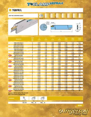 TGBFR/L DEEP FACE GROOVING BLADES Face Grooving Dmin TmaxDmax A H B L 150° Designation InsertSeatSize H(inch) B(inch) L(inch) A(inch) Tmax(inch) Dmin(inch) Dmax(inch) TGBFL32T20-40-60-3 3 0.976 1.26 5.90 0.205 0.787 1.57 2.36 TGBFL32T20-54-80-3 3 0.976 1.26 5.90 0.205 0.787 2.13 3.15 TGBFL32T25-74-120-3 3 0.976 1.26 5.90 0.205 0.984 2.91 4.72 TGBFL32T25-114-180-3 3 0.976 1.26 5.90 0.205 0.984 4.49 7.09 TGBFL32T25-40-60-4 4 0.976 1.26 5.90 0.205 0.984 1.57 2.36 TGBFL32T25-50-80-4 4 0.976 1.26 5.90 0.205 0.984 1.97 3.15 TGBFL32T30-70-130-4 4 0.976 1.26 5.90 0.205 1.181 2.76 5.12 TGBFL32T30-120-200-4 4 0.976 1.26 5.90 0.205 1.181 4.72 7.87 TGBFL32T30-200-4 4 0.976 1.26 5.90 0.205 1.181 7.87 INF TGBFL32T32-60-95-5 5 0.976 1.26 5.90 0.205 1.260 2.36 3.74 TGBFL32T35-85-140-5 5 0.976 1.26 5.90 0.205 1.378 3.35 5.51 TGBFL32T35-130-250-5 5 0.976 1.26 5.90 0.205 1.378 5.12 9.84 TGBFL32T35-250-5 5 0.976 1.26 5.90 0.205 1.378 9.84 INF TGBFL32T32-80-180-6 6 0.976 1.26 5.90 0.205 1.260 3.15 7.09 TGBFL32T38-168-300-6 6 0.976 1.26 5.90 0.205 1.496 6.61 11.81 TGBFL32T38-300-6 6 0.976 1.26 5.90 0.205 1.496 11.81 INF TGBFR32T20-40-60-3 3 0.976 1.26 5.90 0.205 0.787 1.57 2.36 TGBFR32T20-54-80-3 3 0.976 1.26 5.90 0.205 0.787 2.13 3.15 TGBFR32T25-74-120-3 3 0.976 1.26 5.90 0.205 0.984 2.91 4.72 TGBFR32T25-114-180-3 3 0.976 1.26 5.90 0.205 0.984 4.49 7.09 TGBFR32T25-40-60-4 4 0.976 1.26 5.90 0.205 0.984 1.57 2.36 TGBFR32T25-50-80-4 4 0.976 1.26 5.90 0.205 0.984 1.97 3.15 TGBFR32T30-70-130-4 4 0.976 1.26 5.90 0.205 1.181 2.76 5.12 TGBFR32T30-120-200-4 4 0.976 1.26 5.90 0.205 1.181 4.72 7.87 TGBFR32T30-200-4 4 0.976 1.26 5.90 0.205 1.181 7.87 INF TGBFR32T32-60-95-5 5 0.976 1.26 5.90 0.205 1.260 2.36 3.74 TGBFR32T35-85-140-5 5 0.976 1.26 5.90 0.205 1.378 3.35 5.51 TGBFR32T35-130-250-5 5 0.976 1.26 5.90 0.205 1.378 5.12 9.84 TGBFR32T35-250-5 5 0.976 1.26 5.90 0.205 1.378 9.84 INF TGBFR32T32-80-180-6 6 0.976 1.26 5.90 0.205 1.260 3.15 11.81 TGBFR32T38-168-300-6 6 0.976 1.26 5.90 0.205 1.496 6.61 7.09 TGBFR32T38-300-6 6 0.976 1.26 5.90 0.205 1.496 11.81 INF Use inserts TDC/TSC, TDJ/TSJ, TDXU, TDT, TDFT. NOTE: Insert Extractor Sold Separately. HARDWARE Insert Extractor Block Block EDG-33B TTBU__-32 TTBN__-32 235