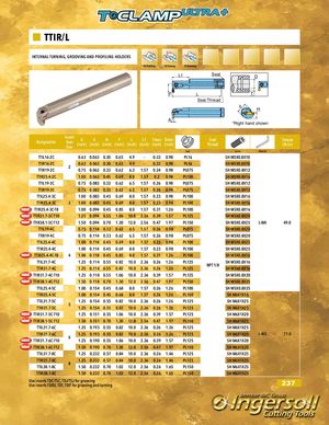 TTIR/L INTERNAL TURNING, GROOVING AND PROFILING HOLDERS ID Profiling ID Turning ID Grooving L1 Seal D F L T Seal Thread d H A *Right hand shown Designation InsertSeatSized(inch)A(inch)H(inch)F(inch)L(inch)L1(inch)Tmax(inch) Dmin(inch) SealThread Torque(lb-in) Seal Screw Wrench TTIL16-2C 0.63 0.063 0.30 0.65 4.9 - 0.33 0.98 PL16 SH M5X0.8X10 TTIR16-2C 0.63 0.063 0.30 0.65 4.9 - 0.33 0.98 PL16 SH M5X0.8X10 2 TTIR19-2C 0.75 0.063 0.33 0.62 6.3 1.57 0.24 0.98 PL075 SH M5X0.8X12 TTIR25.4-2C 1.00 0.063 0.45 0.69 8.0 1.57 0.2 0.98 PL100 SH M5X0.8X16 TTIL19-3C 0.75 0.083 0.33 0.62 6.5 1.57 0.26 0.98 PL075 SH M5X0.8X12 TTIR19-3C 0.75 0.083 0.33 0.62 6.5 1.57 0.26 0.98 PL075 SH M5X0.8X12 TTIL25.4-3C 1.00 0.083 0.45 0.69 8.0 1.57 0.23 0.98 PL100 SH M5X0.8X16 TTIR25.4-3C 3 1.00 0.083 0.45 0.69 8.0 1.57 0.23 0.98 PL100 SH M5X0.8X16 TTIR25.4-3C-T8 1.00 0.094 0.45 0.85 8.0 1.57 0.31 1.26 PL100 SH M5X0.8X16 TTIR31.7-3C-T10 1.25 0.094 0.55 1.06 10.0 2.36 0.39 1.57 PL125 SH M5X0.8X20 TTIR38.1-3C-T12 1.50 0.094 0.70 1.30 12.0 2.56 0.47 1.97 PL150 SH M5X0.8X25 L-W4 49.0 TTIL19-4C 0.75 0.114 0.33 0.62 6.5 1.57 0.26 0.98 PL075 SH M5X0.8X20 TTIR19-4C 0.75 0.114 0.33 0.62 6.5 1.57 0.26 0.98 PL075 SH M5X0.8X20 TTIL25.4-4C 1.00 0.114 0.45 0.69 8.0 1.57 0.23 0.98 PL100 SH M5X0.8X25 TTIR25.4-4C 1.00 0.114 0.45 0.69 8.0 1.57 0.23 0.98 PL100 SH M5X0.8X25 TTIR25.4-4C-T8 4 1.00 0.118 0.45 0.85 8.0 1.57 0.31 1.26 PL100 SH M5X0.8X16 TTIL31.7-4C 1.25 0.114 0.55 0.82 10.0 2.36 0.26 1.26 PL125 SH M5X0.8X16 NPT 1/8 TTIR31.7-4C 1.25 0.114 0.55 0.82 10.0 2.36 0.26 1.26 PL125 SH M5X0.8X16 TTIR31.7-4C-T10 1.25 0.118 0.55 1.06 10.0 2.36 0.39 1.57 PL125 SH M5X0.8X20 TTIR38.1-4C-T12 1.50 0.118 0.70 1.30 12.0 2.56 0.47 1.97 PL150 SH M5X0.8X25 TTIL25.4-5C 1.00 0.154 0.45 0.68 8.0 1.57 0.26 1.26 PL100 SH M5X0.8X25 TTIR25.4-5C 1.00 0.154 0.45 0.68 8.0 1.57 0.26 1.26 PL100 SH M6X1X16 TTIL31.7-5C 1.25 0.154 0.55 0.82 10.0 2.36 0.26 1.26 PL125 SH M6X1X25 5 TTIR31.7-5C 1.25 0.154 0.55 0.82 10.0 2.36 0.26 1.26 PL125 SH M6X1X25 TTIR31.7-5C-T10 1.25 0.151 0.55 1.06 10.0 2.36 0.39 1.57 PL125 SH M6X1X20 TTIR38.1-5C-T12 1.50 0.151 0.70 1.30 12.0 2.56 0.47 1.97 PL150 SH M6X1X25 TTIL31.7-6C 1.25 0.193 0.55 0.82 10.0 2.36 0.26 1.26 PL125 SH M6X1X25 TTIR31.7-6C 1.25 0.193 0.55 0.82 10.0 2.36 0.26 1.26 PL125 SH M6X1X20 L-W5 71.0 6 TTIR31.7-6C-T10 1.25 0.190 0.55 1.06 10.0 2.36 0.39 1.57 PL125 SH M6X1X20 TTIR38.1-6C-T12 1.50 0.190 0.70 1.30 12.0 2.56 0.47 1.97 PL150 SH M6X1X25 TTIL31.7-8C 1.25 0.232 0.57 0.84 10.0 2.36 0.26 1.46 PL125 SH M6X1X25 TTIR31.7-8C 1.25 0.232 0.57 0.84 10.0 2.36 0.26 1.46 PL125 SH M6X1X25 8 TTIL38.1-8C 1.50 0.232 0.70 1.02 12.0 2.56 0.26 1.65 PL150 SH M6X1X25 TTIR38.1-8C 1.50 0.232 0.70 1.02 12.0 2.56 0.26 1.65 PL150 SH M6X1X25 Use inserts TDC/TSC, TDJ/TSJ for grooving Use inserts TDXU, TDT, TDIT for grooving and turning 237