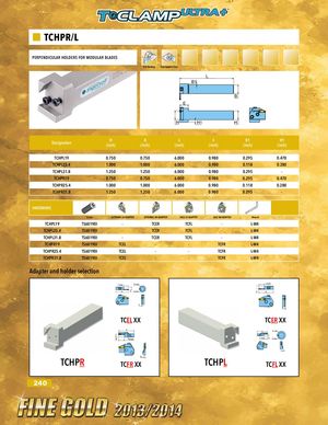 TCHPR/L PERPENDICULAR HOLDERS FOR MODULAR BLADES OD Turning Face Groove Turn L B1 B E H H1 H Designation H B L E B1 H1(inch)(inch)(inch)(inch)(inch)(inch) TCHPL19 0.750 0.750 6.000 0.980 0.295 0.470 TCHPL25.4 1.000 1.000 6.000 0.980 0.118 0.280 TCHPL31.8 1.250 1.250 6.000 0.980 0.295 - TCHPR19 0.750 0.750 6.000 0.980 0.295 0.470 TCHPR25.4 1.000 1.000 6.000 0.980 0.118 0.280 TCHPR31.8 1.250 1.250 6.000 0.980 0.295 - HARDWARE Screw EXTERNAL LH ADAPTER EXTERNAL RH ADAPTER FACE LH ADAPTER FACE RH ADAPTER Wrench TCHPL19 TS60190I - TCER TCFL - L-W4 TCHPL25.4 TS60190I - TCER TCFL - L-W4 TCHPL31.8 TS60190I - TCER TCFL - L-W4 TCHPR19 TS60190I TCEL - - TCFR L-W4 TCHPR25.4 TS60190I TCEL - - TCFR L-W4 TCHPR31.8 TS60190I TCEL - - TCFR L-W4 Adapter and holder selection T max D max Tmax L F D min F L F A TCEL XX TCER XX L L D max F Tmax T max F D min A TCHPR TCFR XX TCHPL TCFL XX 240 A
