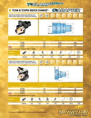 TCHN & TCHPN QUICK-CHANGE* ADAPTER FOR EXTERNAL TURNING AND GROOVING (LEFT HAND OR RIGHT HAND) OR FACE TURNING AND GROOVING OD Turning Face Groove Turn L Tmax D F Designation L D F(inch)(mm)(inch) C4-TCHN 2.16 40 mm 0.480 C5-TCHN 2.28 50 mm 0.677 C6-TCHN 2.36 63 mm 0.874 C8-TCHN 2.56 80 mm 1.197 *compatable with Sandvik‘s COROMANT CAPTO® (**) system. HARDWARE Screw FACE LH ADAPTER EXTERNAL LH ADAPTER FACE RH ADAPTER EXTERNAL RH ADAPTER Wrench Nozzle TS60190I TCFL TCEL TCFR TCER L-W4 NZ125 ADAPTER FOR EXTERNAL TURNING AND GROOVING (LEFT HAND OR RIGHT HAND) OR FACE TURNING AND GROOVING OD Turning Face Grooving F D L Designation L D F(inch)(mm)(inch) C4-TCHPN 1.38 40 mm 1.20 C5-TCHPN 1.57 50 mm 1.40 C6-TCHPN 1.65 63 mm 1.40 C8-TCHPN 2.17 80 mm 1.67 *compatable with Sandvik‘s COROMANT CAPTO® (**) system. HARDWARE Screw FACE LH ADAPTER EXTERNAL LH ADAPTER FACE RH ADAPTER EXTERNAL RH ADAPTER Wrench Nozzle Nozzle Pipe TS60190I TCFL TCEL TCFR TCER L-W4 NZ125 NZP5 241 (**) The trademark COROMANT CAPTO® is owned by Sandvik Intellectual Property AB.