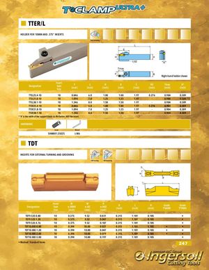 TTER/L HOLDER FOR 10MM AND .375“ INSERTS Face Grooving L E H H H2 A Tmax F B Right-hand holder shown Designation InsertSeatSize F(inch) L(inch) H(inch) B(inch) E(inch) H2(inch) Tmax(inch) A*(inch) TTEL25.4-10 10 0.846 6.0 1.00 1.00 1.97 0.276 0.984 0.309 TTEL31.8-10 10 1.094 7.0 1.25 1.25 1.97 - 0.984 0.309 TTEL38.1-10 10 1.346 8.0 1.50 1.50 1.97 - 0.984 0.309 TTER25.4-10 10 0.846 6.0 1.00 1.00 1.97 0.276 0.984 0.309 TTER31.8-10 10 1.094 7.0 1.25 1.25 1.97 - 0.984 0.309 TTER38.1-10 10 1.346 8.0 1.50 1.50 1.97 - 0.984 0.309 * “A” is the width of the support blade on the holder, NOT the insert. HARDWARE Screw Wrench SHM8X1.25X25 L-W6 TDT INSERTS FOR EXTERNAL TURNING AND GROOVING OD Turning OD Grooving R W B 7° L H Designation Insert W WSeat±.0008±.02Size(inch)(mm)R±.002(inch) B(inch) L(inch) H Grade Grade(inch)TT6080TT9080 TDT9.52E-0.80 10 0.375 9.52 0.031 0.315 1.181 0.185 • TDT9.52E-1.20 10 0.375 9.52 0.047 0.315 1.181 0.185 • TDT9.52E-4.76 10 0.375 9.52 0.187 0.315 1.181 0.185 • TDT10.00E-0.80 10 0.394 10.00 0.031 0.315 1.181 0.185 • • TDT10.00E-1.20 10 0.394 10.00 0.047 0.315 1.181 0.185 • • TDT10.00E-2.00 10 0.394 10.00 0.079 0.315 1.181 0.185 • • TDT10.00E-5.00 10 0.394 10.00 0.197 0.315 1.181 0.185 • • Marked: Standard items 247