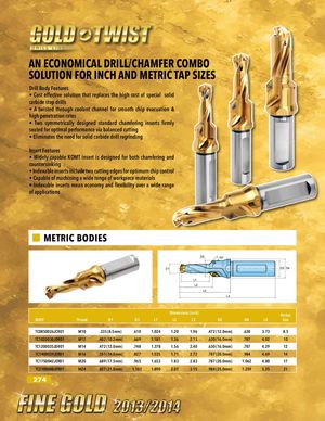 AN ECONOMICAL DRILL/CHAMFER COMBO SOLUTION FOR INCH AND METRIC TAP SIZES Drill Body Features • Cost effective solution that replaces the high cost of special solid carbide step drills • A twisted through coolant channel for smooth chip evacuation & high penetration rates • Two symmetrically designed standard chamfering inserts firmly seated for optimal performance via balanced cutting • Eliminates the need for solid carbide drill regrinding Insert Features • Widely capable KOMT insert is designed for both chamfering and countersinking • Indexable inserts include two cutting edges for optimum chip control • Capable of machining a wide range of workpiece materials • Indexable inserts mean economy and flexibility over a wide range of applications METRIC BODIES D3 45° D1 D2 D4 L1 L2 L3 L4 Dimensions (inch) Pocket BODY Thread D1 D3 L1 L2 L3 D2 D4 L4 Size TC0850026JCR01 M10 .335 (8.5mm) .610 1.024 1.20 1.96 .472 (12.0mm) .630 3.73 8.5 TC1020030JDR01 M12 .402 (10.2mm) .669 1.181 1.36 2.13 .630 (16.0mm) .787 4.02 10 TC1200035JDR01 M14 .472 (12.0mm) .748 1.378 1.56 2.40 .630 (16.0mm) .787 4.29 12 TC1400039JER01 M16 .551 (14.0mm) .827 1.535 1.71 2.72 .787 (20.0mm) .984 4.69 14 TC1750042JER01 M20 .689 (17.5mm) .965 1.653 1.83 2.83 .787 (20.0mm) 1.062 4.80 17 TC2100048JFR01 M24 .827 (21.0mm) 1.102 1.890 2.07 3.15 .984 (25.0mm) 1.259 5.35 21 274