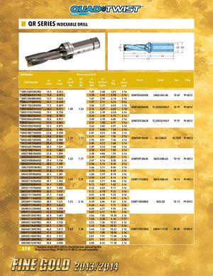QR SERIES INDEXABLE DRILL D1 D2 D3 L1 L2 L4 L3 3xD Bodies Dimensions (inch) Drill Number D1(mm) D1(inch) D2ShankDiaD3FigDiaL1 L2Max.Ext FromDOCHolderL3OALL4ShankLgthInsert Screw Torx Plug * QR0143043N5R02 14.3 0.563 1.69 2.68 5.83 3.16 * QR0150045N5R02 15.0 0.591 1.78 2.83 5.98 3.16 SOMT050204SK SM20-043-00 TD 6P PF-0012 * QR0159048N5R02 15.9 0.626 1.87 2.99 6.14 3.16 * QR0167050N5R02 16.7 0.658 1.97 3.11 6.26 3.16 * QR0175053N5R02 17.5 0.689* QR0183055N5R0218.30.7211.001.262.062.163.273.276.426.42 3.163.16SOMT060204SK TS 22052I/HG-P TD 7P PF-0012 * QR0191057N5R02 19.1 0.750 2.25 3.39 6.54 3.16 * QR0198059N5R02 19.8 0.781 2.34 3.58 6.73 3.16 * QR0206062N5R02 20.6 0.813* QR0214064N5R0221.40.8432.442.53 3.703.82 6.856.97 3.163.16SOMT070306SK TS 22052I/HG-P TP 7P PF-0012 *QR0222067N5R02 22.2 0.875 2.63 3.82 6.97 3.16 *QR0230069N6R02 23.0 0.906 2.72 4.09 7.24 3.16 *QR0238071N6R02 23.8 0.938 2.81 4.25 7.40 3.16 *QR0246074N6R02*QR0250075N5R0224.625.00.9690.9841.251.772.912.95 4.414.41 7.567.56 3.163.16SOMT08T306SK SO 25065I DS-T07S PF-0013 *QR0254076N6R02 25.4 1.000 3.00 4.53 7.68 3.16 *QR0262079N6R02 26.2 1.031 3.09 4.53 7.68 3.16 QR0270081N6R02 27.0 1.063 3.19 4.65 7.80 3.16 QR0278083N6R02 27.8 1.094 3.28 4.80 7.95 3.16 QR0286086N6R02QR0294088N6R0228.629.41.1251.1561.251.77 3.383.47 4.925.16 8.078.303.163.16 SOMT09T306SK SM35-088-60 TD 10 PF-0013 QR0302090N6R02 30.2 1.187 3.56 5.16 8.30 3.16 QR0310093N6R02 31.0 1.219 3.66 5.31 8.46 3.16 QR0318095N6R02 31.8 1.250 3.75 5.43 8.58 3.16 QR0325098N6R02 32.5 1.281 3.84 5.59 8.74 3.16 QR0333100N6R02QR0341102N6R0233.334.11.3121.3431.251.77 3.944.03 5.595.71 8.748.863.163.16 SOMT11T308SK SM35-088-60 TD 10 PF-0013 QR0349105N6R02 34.9 1.375 4.13 5.87 9.02 3.16 QR0357107N6R02 35.7 1.406 4.22 6.02 9.17 3.16 QR0365110N6R02 36.5 1.437 4.31 6.18 9.33 3.16 QR0373112N6R02 37.3 1.468 4.41 6.18 9.33 3.16 QR0381114N6R02 38.1 1.500 4.50 6.34 9.49 3.16 QR0389117N6R02 38.9 1.531 1.25 2.16 4.59 6.46 9.61 3.16 SOMT130408SK SE02-82 TD 15 PF-0013 QR0397119N6R02 39.7 1.562 4.69 6.61 9.76 3.16 QR0405122N6R02 40.5 1.594 4.69 6.77 9.92 3.16 QR0413124N6R02 41.3 1.625 4.87 6.77 9.92 3.16 QR0428128N7R02 42.8 1.687 5.06 7.05 10.20 3.16 QR0437131N7R02 43.7 1.719 1.50 2.36 5.16 7.17 QR0445134N7R02 44.5 1.750 5.25 7.36 10.51 3.16 QR0452136N7R02 45.2 1.781 5.34 7.36 10.51 3.16 QR0460138N7R02 46.0 1.813 1.50 2.36 5.44 7.52 10.67 3.16 SOMT150510SK SM50-113-20 TD 20 PF-0013 QR0476143N7R02 47.6 1.875 5.63 7.80 10.94 3.16 QR0492148N7R02 49.2 1.937 5.81 7.91 11.06 3.16 QR0500150N7R02 50.0 1.969 5.91 8.07 11.22 3.16 QR0508152N7R02 50.8 2.000 6.00 8.23 11.38 3.16 278 * Standard shank (R01) will be phased out and replaced by R02.Brass Coolant Plugs, PF-0012 & PF-0013, are sold separately.