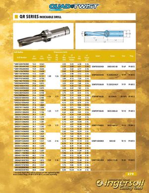 QR SERIES INDEXABLE DRILL D1 D2 D3 L1 L2 L4 L3 4xD Bodies Dimensions (inch) Drill Number D1(mm) D1(inch) D2ShankDiaD3FigDia L1 L2Max.Ext FromDOCHolderL3OALL4ShankLgthInsert Screw Torx Plug * QR0143057N5R02 14.3 0.563 2.25 3.23 6.38 3.16 * QR0150060N5R02 15.0 0.591 2.37 3.43 6.57 3.16 SOMT050204SK SM20-043-00 TD 6P PF-0012 * QR0159064N5R02 15.9 0.626 2.50 3.62 6.77 3.16 * QR0167067N5R02 16.7 0.658 2.63 3.78 6.93 3.16 * QR0175070N5R02 17.5 0.689* QR0183073N5R0218.30.7211.001.262.752.873.983.987.137.13 3.163.16SOMT060204SK TS 22052I/HG-P TD 7P PF-0012 * QR0191076N5R02 19.1 0.750 3.00 4.13 7.28 3.16 * QR0198079N5R02 19.8 0.781 3.13 4.37 7.52 3.16 * QR0206082N5R02 20.6 0.813* QR0214086N5R0221.40.843 3.253.374.534.69 7.687.83 3.163.16SOMT070306SK TS 22052I/HG-P TP 7P PF-0012 * QR0222089N5R02 22.2 0.875 3.50 4.69 7.83 3.16 * QR0230092N6R02 23.0 0.906 3.62 5.00 8.15 3.16 * QR0238095N6R02 23.8 0.938 3.75 5.20 8.35 3.16 * QR0246098N6R02* QR0250100N5R0224.625.00.9690.9841.251.77 3.873.945.395.39 8.548.54 3.163.16SOMT08T306SK SO 25065I DS-T07S PF-0013 * QR0254102N6R02 25.4 1.000 4.00 5.55 8.70 3.16 * QR0262105N6R02 26.2 1.031 4.13 5.55 8.70 3.16 QR0270108N6R02 27.0 1.063 4.25 5.71 8.86 3.16 QR0278111N6R02 27.8 1.094 4.38 5.91 9.06 3.16 QR0286114N6R02QR0294118N6R0228.629.41.1251.1561.251.77 4.504.626.066.34 9.219.49 3.163.16SOMT09T306SK SM35-088-60 TD 10 PF-0013 QR0302120N6R02 30.2 1.187 4.75 6.34 9.49 3.16 QR0310124N6R02 31.0 1.219 4.87 6.54 9.69 3.16 QR0318127N6R02 31.8 1.250 5.00 6.69 9.84 3.16 QR0325130N6R02 32.5 1.281 5.13 6.89 10.04 3.16 QR0333133N6R02QR0341136N6R0233.334.11.3121.3431.251.77 5.255.376.897.05 10.0410.203.163.16SOMT11T308SK SM35-088-60 TD 10 PF-0013 QR0349140N6R02 34.9 1.375 5.50 7.24 10.39 3.16 QR0357143N6R02 35.7 1.406 5.62 7.44 10.59 3.16 QR0365146N6R02 36.5 1.437 5.75 7.64 10.79 3.16 QR0373149N6R02 37.3 1.468 5.87 7.64 10.79 3.16 QR0381152N6R02 38.1 1.500 6.00 7.83 10.98 3.16 QR0389156N6R02 38.9 1.531 1.25 2.16 6.13 7.99 11.14 3.16 SOMT130408SK SE02-82 TD 15 PF-0013 QR0397159N6R02 39.7 1.562 6.25 8.19 11.34 3.16 QR0405162N6R02 40.5 1.594 6.25 8.39 11.54 3.16 QR0413165N6R02 41.3 1.625 6.50 8.39 11.54 3.16 QR0428171N7R02 42.8 1.687 6.75 8.74 11.89 3.16 QR0437175N7R02 43.7 1.719 1.50 2.36 6.87 8.90 QR0445178N7R02 44.5 1.750 7.00 9.13 12.28 3.16 QR0452181N7R02 45.2 1.781 7.13 9.13 12.28 3.16 QR0460184N7R02 46.0 1.813 1.50 2.36 7.25 9.33 12.48 3.16 SOMT150510SK SM50-113-20 TD 20 PF-0013 QR0476190N7R02 47.6 1.875 7.50 9.69 12.83 3.16 QR0492197N7R02 49.2 1.937 7.75 9.84 12.99 3.16 QR0500200N7R02 50.0 1.969 7.87 10.04 13.19 3.16 QR0508203N7R02 50.8 2.000 8.00 10.24 13.39 3.16 * Standard shank (R01) will be phased out and replaced by R02.Brass Coolant Plugs, PF-0012 & PF-0013, are sold separately. 279