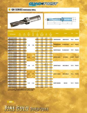 QR SERIES INDEXABLE DRILL D1 D2 D3 L1 L2 L4 L3 5xD Bodies Dimensions (inch) Drill Number D1(mm) D1(inch) D2ShankDiaD3FigDia L1 L2Max.Ext FromDOCHolderL3OALL4ShankLgthInsert Screw Torx Plug * QR0143072N5R02 14.3 0.563 2.81 3.78 6.94 3.16 * QR0150075N5R02 15.0 0.591 2.96 4.02 7.17 3.16 SOMT050204SK SM20-043-00 TD 6P PF-0012 * QR0159080N5R02 15.9 0.626 3.13 4.25 7.40 3.16 *QR0167083N5R02 16.7 0.658 3.29 4.45 7.60 3.16 *QR0175087N5R02 17.5 0.689*QR0183091N5R0218.30.7211.001.263.443.594.694.69 7.847.84 3.163.16SOMT060204SK TS 22052I/HG-P TD 7P PF-0012 *QR0191095N5R02 19.1 0.750 3.75 4.88 8.03 3.16 *QR0198099N5R02 19.8 0.781 3.91 5.16 8.31 3.16 *QR0206103N5R02 20.6 0.813*QR0214107N5R0221.40.843 4.074.225.355.55 8.508.70 3.163.16SOMT070306SK TS 22052I/HG-P TP 7P PF-0012 *QR0222111N5R02 22.2 0.875 4.38 5.55 8.70 3.16 *QR0230115N6R02 23.0 0.906 4.53 5.91 9.06 3.16 *QR0238119N6R02 23.8 0.938 4.69 6.14 9.29 3.16 *QR0246123N6R02*QR0250125N5R0224.625.00.9690.9841.251.77 4.854.856.386.38 9.539.53 3.163.16SOMT08T306SK SO 25065I DS-T07S PF-0013 *QR0254127N6R02 25.4 1.000 5.00 6.57 9.72 3.16 *QR0262131N6R02 26.2 1.031 5.16 6.57 9.72 3.16 QR0270135N6R02 27.0 1.063 5.31 6.77 9.92 3.16 QR0278139N6R02 27.8 1.094 5.47 7.01 10.15 3.16 QR0286143N6R02QR0294147N6R0228.629.41.1251.1561.251.77 5.635.787.207.52 10.3410.64 3.163.16SOMT09T306SK SM35-088-60 TD 10 PF-0013 QR0302151N6R02 30.2 1.187 5.94 7.52 10.68 3.16 QR0310155N6R02 31.0 1.219 6.09 7.76 10.90 3.16 QR0318159N6R02 31.8 1.250 6.25 7.95 11.09 3.16 QR0325163N6R02 32.5 1.281 6.41 8.19 11.32 3.16 QR0333167N6R02QR0341171N6R0233.334.11.3121.3431.251.77 6.566.728.198.39 11.3511.54 3.163.16SOMT11T308SK SM35-088-60 TD 10 PF-0013 QR0349175N6R02 34.9 1.375 6.88 8.62 11.77 3.16 QR0357179N6R02 35.7 1.406 7.03 8.86 12.00 3.16 QR0365182N6R02 36.5 1.437 7.19 9.09 12.24 3.16 QR0373186N6R02 37.3 1.468 7.34 9.09 12.24 3.16 QR0381191N6R02 38.1 1.500 7.50 9.33 12.26 3.16 QR0389194N6R02 38.9 1.531 1.25 2.16 7.66 9.53 12.67 3.16 SOMT130408SK SE02-82 TD 15 PF-0013 QR0397198N6R02 39.7 1.562 7.81 9.76 12.91 3.16 QR0405202N6R02 40.5 1.594 7.81 10.00 13.15 3.16 QR0413206N6R02 41.3 1.625 8.13 10.00 13.15 3.16 * Standard shank (R01) will be phased out and replaced by R02. Brass Coolant Plugs, PF-0012 & PF-0013, are sold separately. 280