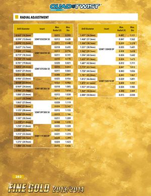 RADIAL ADJUSTMENT Drill Diameter Insert Max. Max.Radial (X)DiaDrill Diameter Insert Max. Max.Radial (X)Dia 0.563" (14.3mm) 0.015 0.593 1.437" (36.5mm) 0.047 1.531 0.594" (15.0mm) SOMT 050204 SK 0.013 0.620 1.468" (37.3mm) 0.047 1.562 0.626" (15.9mm) 0.011 0.648 1.500" (38.1mm) 0.039 1.578 0.657" (16.7mm) 0.018 0.693 1.531" (38.9mm) 0.035 1.601 SOMT 130408 DP 0.688" (17.5mm) 0.013 0.714 1.562" (39.7mm) 0.028 1.618 SOMT 060204 SK 0.719" (18.3mm) 0.011 0.741 1.594" (40.5mm) 0.024 1.642 0.750" (19.1mm) 0.010 0.770 1.625" (41.3mm) 0.024 1.673 0.781" (19.8mm) 0.020 0.821 1.687" (42.8mm) 0.012 1.711 0.813" (20.6mm) 0.015 0.843 1.719" (43.7mm) 0.047 1.813 SOMT 070306 SK 0.843" (21.4mm) 0.011 0.865 1.750" (44.5mm) 0.043 1.836 0.875" (22.2mm) 0.008 0.891 1.781" (45.2mm) 0.043 1.867 0.906" (23.0mm) 0.025 0.956 1.813" (46.0mm) 0.039 1.891 SOMT 150510 DP 0.938" (23.8mm) 0.022 0.982 1.875" (47.6mm) 0.028 1.931 0.969" (24.6mm) 0.018 1.005SOMT 08T306 SK1.937" (49.2mm) 0.024 1.985 0.984" (25.0mm) 0.015 1.014 1.969" (50.0mm) 0.020 2.009 1.000" (25.4mm) 0.015 1.030 2.000" (50.8mm) 0.015 2.030 1.031" (26.2mm) 0.011 1.053 1.063" (27.0mm) 0.028 1.119 1.094" (27.8mm) 0.024 1.142 1.125" (28.6mm) 0.015 1.155 SOMT 09T308 SK 1.156" (29.4mm) 0.015 1.186 1.187" (30.2mm) 0.011 1.209 1.219" (31.0mm) 0.008 1.235 1.250" (31.8mm) 0.035 1.320 1.281" (32.5mm) 0.031 1.343 1.312" (33.3mm) 0.031 1.374 SOMT 11T308 DP 1.343" (34.1mm) 0.028 1.399 1.375" (34.9mm) 0.024 1.423 1.406" (35.7mm) 0.015 1.436 282