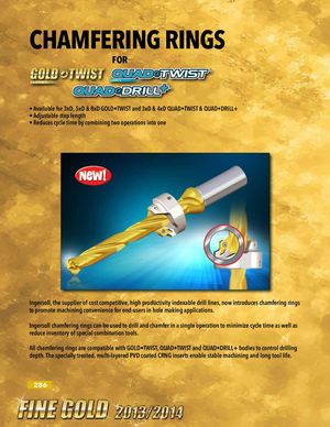 CHAMFERING RINGS FOR • Available for 3xD, 5xD & 8xD GOLD•TWIST and 3xD & 4xD QUAD•TWIST & QUAD•DRILL+ • Adjustable step length • Reduces cycle time by combining two operations into one Ingersoll, the supplier of cost competitive, high productivity indexable drill lines, now introduces chamfering rings to promote machining convenience for end-users in hole making applications. Ingersoll chamfering rings can be used to drill and chamfer in a single operation to minimize cycle time as well as reduce inventory of special combination tools. All chamfering rings are compatible with GOLD•TWIST, QUAD•TWIST and QUAD•DRILL+ bodies to control drilling depth. The specially treated, multi-layered PVD coated CRNG inserts enable stable machining and long tool life. 286