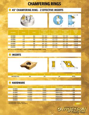 CHAMFERING RINGS 45° CHAMFERING RING – 2 EFFECTIVE INSERTS DOC D T Fits Gold Twist Fits Quad Twist Fits Quad Drill+ Maximum Description D (inch) T (inch) Series Series Series Chamfer Dia. Range (mm) Dia. Range (mm) Dia. Range (mm) Size CB140R02 1.50 .866 13.5 – 14.4 13.5 – 14.4 13.5 – 14.4 .118 x 45° CB150R02 1.50 .866 14.5 – 15.9 14.5 – 15.4 14.5 – 15.4 .118 x 45° CB160R02 1.65 .906 16.0 – 16.9 15.5 – 16.4 15.5 – 16.4 .118 x 45° CB170R02 1.65 .906 17.0 – 17.9 16.5 – 17.4 16.5 – 17.4 .118 x 45° CB180R02 1.65 .906 18.0 – 18.9 17.5 – 18.4 17.5 – 18.4 .118 x 45° CB190R02 1.65 .945 19.0 – 19.9 18.5 – 19.4 18.5 – 19.4 .118 x 45° CB200R02 1.65 .945 20.0 – 20.9 19.5 – 20.4 19.5 – 20.4 .118 x 45° NOTE: For use with GOLD•TWIST 3, 5 & 8xD and QUAD•TWIST & QUAD•DRILL+ 3 & 4xD. INSERTS W S L 45° Desigation L W S Grade CRNG-0802-45CD .583 .295 .144 IN2505 HARDWARE Description Insert Screw Torx Clamping Screw Wrench CB140R02 SO 25065I DS-T07S SHM4x0.7x12(1) L-W3 CB150R02 SO 25065I DS-T07S SHM4x0.7x12(1) L-W3 CB160R02 SO 25065I DS-T07S SHM5x0.8x16(2) L-W4 CB170R02 SO 25065I DS-T07S SHM5x0.8x16(2) L-W4 CB180R02 SO 25065I DS-T07S SHM5x0.8x16(2) L-W4 CB190R02 SO 25065I DS-T07S SHM5x0.8x16(2) L-W4 CB200R02 SO 25065I DS-T07S SHM5x0.8x16(2) L-W4 (1) Clamping torque: 4 [N•m] 36 [lbf-in] (2) Clamping torque: 7-8 [N•m] 84-96 [lbf-in] 287