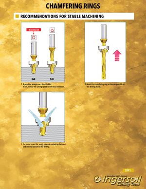 CHAMFERING RINGS RECOMMENDATIONS FOR STABLE MACHINING Recommend 3xD 5xD 1. If possible, always use a short holder. 2. Mount the chamfering ring as close as possible to If not, reduce the cutting speed to minimize vibration. the drilling shank. 3. For better insert life, apply external coolant to the insert and internal coolant to the drill tip. 291