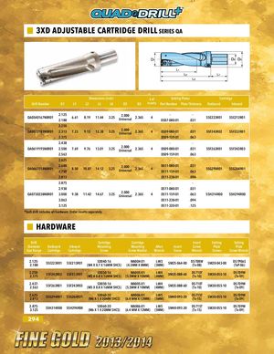 3XD ADJUSTABLE CARTRIDGE DRILL SERIES QA 4 4 Dimensions (inch) # of Setting Plates Cartridge Drill Number D1 L1 L2 L3 L4 D2 D3 inserts Part Number Plate Thickness Outboard Inboard 2.125QA0540167N8R016.612.1888.1911.44 3.25 2.000Universal2.3654 -DS07-080-01 -.031 55E223R01 55E213R01 2.250 - - QA0572181N8R01 2.313 7.23 9.13 12.38 3.25 2.000Universal2.3654 DS09-080-01 .031 55F243R02 55F233R01 2.375 DS09-159-01 .063 2.438 - - QA0619195N8R01 2.500 7.69 9.76 13.01 3.25 2.000Universal2.3654 DS09-080-01 .031 55F263R01 55F243R03 2.563 DS09-159-01 .063 2.625 - - QA0667214N8R01 2.6882.7508.50 10.87 14.12 3.25 2.000Universal2.3654 DS11-080-01DS11-159-01.031.063 55G294R01 55G264R01 2.813 DS11-238-01 .094 2.875 - - 2.938 DS11-080-01 .031 QA0730238N8R01 3.000 9.38 11.42 14.67 3.25 2.000Universal2.3654 DS11-159-01 .063 55H314R00 55H294R00 3.063 DS11-238-01 .094 3.125 DS11-320-01 .125 *Each drill includes all hardware. Order inserts separately. HARDWARE Drill Cartridge Cartridge Insert Setting Setting Diameter Outboard Inboard Mounting Mounting Allen Insert Screw Plate Plate Size Range Cartridge Cartridge Screw Screw Washer Wrench Screw Wrench Screws Screw Wrench 2.125-2.188 55E223R01 55E213R01 SD040-16(M4 X 0.7 X 16MM SHCS)WA004-01(4.3MM X 8MM)L-W3(3MM)SM25-064-00 DS-T08W(Tx-08)SM20-043-00 DS-TP06S(TxP-06) 2.250-2.375 55F243R02 55F233R01 SD050-16(M5 X 0.8 X 16MM SHCS)WA005-01(5.5MM X 10MM)L-W4(4MM)SM35-088-60DS-T10T(Tx-10)SM30-055-10 DS-T09W(Tx-09) 2.437-2.563 55F263R01 55F243R03 SD050-16(M5 X 0.8 X 16MM SHCS)WA005-01(5.5MM X 10MM)L-W4(4MM)SM35-088-60DS-T10T(Tx-10)SM30-055-10 DS-T09W(Tx-09) 2.625-2.813 55G294R01 55G264R01 SD060-20(M6 X 1 X 20MM SHCS) WA006-01(6.4 MM X 12MM)L-W5(5MM)SM40-093-20DS-T15T(Tx-15)SM30-055-10 DS-T09W(Tx-09) 2.875-3.12555H314R00 55H294R00 SD060-20(M6 X 1 X 20MM SHCS) WA006-01(6.4 MM X 12MM)L-W5(5MM)SM40-093-20DS-T15T(Tx-15)SM30-055-10 DS-T09W(Tx-09) 294