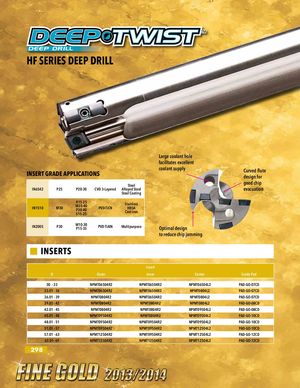 HF SERIES DEEP DRILL Large coolant hole facilitates excellent INSERT GRADE APPLICATIONS coolant supply Curved flutedesign for Steel good chip IN6542 P25 P20-30 CVD 3-Layered Alloyed Steel evacuation Steel Coating IN1510 M30 K15-25M35-40P30-40PVD-TiCNS15-25StainlessHRSACast iron IN2005 P30 M10-30P15-35PVD-TiAlN Multipurpose Optimal design to reduce chip jamming INSERTS Insert D Outer Inner Center Guide Pad 30 - 33 NPMT06504R2 NPMT06504R2 NPMT06504L2 PAD-GO-07CD 33.01 - 36 NPMT06504R2 NPMT06504R2 NPMT0804L2 PAD-GO-07CD 36.01 - 39 NPMT0804R2 NPMT06504R2 NPMT0804L2 PAD-GO-07CD 39.01 - 42 NPMT0804R2 NPMT0804R2 NPMT0804L2 PAD-GO-08CD 42.01 - 45 NPMT0804R2 NPMT0804R2 NPMT09504L2 PAD-GO-08CD 45.01 - 48 NPMT09504R2 NPMT0804R2 NPMT09504L2 PAD-GO-10CD 48.01 - 51 NPMT09504R2 NPMT09504R2 NPMT09504L2 PAD-GO-10CD 51.01 - 57 NPMT09504R2 NPMT09504R2 NPMT12504L2 PAD-GO-10CD 57.01 - 63 NPMT12504R2 NPMT09504R2 NPMT12504L2 PAD-GO-12CD 63.01- 69 NPMT12504R2 NPMT12504R2 NPMT12504L2 PAD-GO-12CD 298