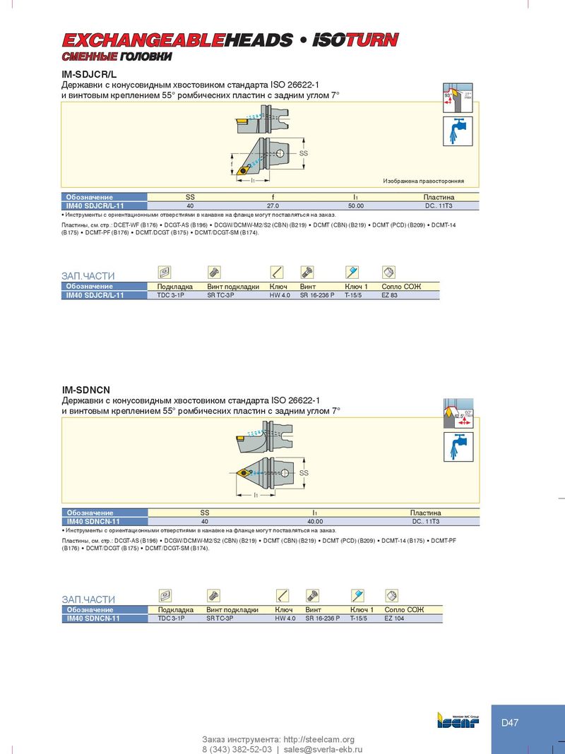 l СМЕННЫЕ ГОЛОВКИ IM-SDJCR/L Державки с конусовидным хвостовиком стандарта ISO 26622-1 и винтовым креплением 55° ромбических пластин с задним углом 7° 93° 27° max SS f l1 Изображена правосторонняя Обозначение SS f l1 Пластина IM40 SDJCR/L-11 40 27.0 50.00 DC.. 11T3 • Инструменты с ориентационными отверстиями в канавке на фланце могут поставляться на заказ. Пластины, см. стр.: DCET‑WF (B176) • DCGT‑AS (B196) • DCGW/DCMW‑M2/S2 (CBN) (B219) • DCMT (CBN) (B219) • DCMT (PCD) (B209) • DCMT‑14 (B175) • DCMT‑PF (B176) • DCMT/DCGT (B175) • DCMT/DCGT‑SM (B174). ЗАП.ЧАСТИ Обозначение Подкладка Винт подкладки Ключ Винт Ключ 1 Сопло СОЖ IM40 SDJCR/L-11 TDC 3-1P SR TC-3P HW 4.0 SR 16-236 P T-15/5 EZ 83 IM-SDNCN Державки с конусовидным хвостовиком стандарта ISO 26622-1 и винтовым креплением 55° ромбических пластин с задним углом 7° 60° 62.5° max SS l1 Обозначение SS l1 Пластина IM40 SDNCN-11 40 40.00 DC.. 11T3 • Инструменты с ориентационными отверстиями в канавке на фланце могут поставляться на заказ. Пластины, см. стр.: DCGT‑AS (B196) • DCGW/DCMW‑M2/S2 (CBN) (B219) • DCMT (CBN) (B219) • DCMT (PCD) (B209) • DCMT‑14 (B175) • DCMT‑PF (B176) • DCMT/DCGT (B175) • DCMT/DCGT‑SM (B174). ЗАП.ЧАСТИ Обозначение Подкладка Винт подкладки Ключ Винт Ключ 1 Сопло СОЖ IM40 SDNCN-11 TDC 3-1P SR TC-3P HW 4.0 SR 16-236 P T-15/5 EZ 104 D47 Заказ инструмента: http://steelcam.org 8 (343) 382-52-03 | sales@sverla-ekb.ru