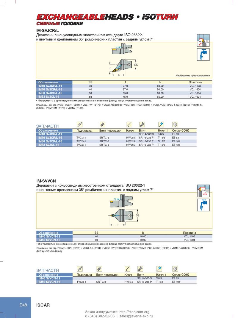l СМЕННЫЕ ГОЛОВКИ IM-SVJCR/L Державки с конусовидным хвостовиком стандарта ISO 26622-1 и винтовым креплением 35° ромбических пластин с задним углом 7° 93° 50° max SS f l1 Изображена правосторонняя Обозначение SS f l1 Пластина IM40 SVJCR/L-11 40 27.0 50.00 VC.. 1103 IM40 SVJCR/L-16 40 27.0 50.00 VC.. 1604 IM50 SVJCR/L-16 50 35.0 60.00 VC.. 1604 IM63 SVJCL-16 63 45.0 65.00 VC.. 1604 • Инструменты с ориентационными отверстиями в канавке на фланце могут поставляться на заказ. Пластины, см. стр.: VBMT (CBN) (B221) • VCET‑WF (B178) • VCGT‑AS (B194) • VCGT‑DW (PCD) (B210) • VCGT/VCMT (PCD & CBN) (B210) • VCMT‑14 (B179) • VCMT‑SM (B179) • VCMW (B180). ЗАП.ЧАСТИ Обозначение Подкладка Винт подкладки Ключ Винт Ключ 1 Сопло СОЖ IM40 SVJCR/L-11 SR 14-560/S T-8/5 EZ 83 IM40 SVJCR/L-16 TVC 3-1 SR TC-3 HW 2.5 SR 16-236 P T-15/5 EZ 83 IM50 SVJCR/L-16 TVC 3-1 SR TC-3 HW 2.5 SR 16-236 P T-15/5 EZ 104 IM63 SVJCL-16 TVC 3-1 SR TC-3 HW 2.5 SR 16-236 P T-15/5 EZ 125 IM-SVVCN Державки с конусовидным хвостовиком стандарта ISO 26622-1 и винтовым креплением 35° ромбических пластин с задним углом 7° 72.5° 70° max SS l1 Обозначение SS l1 Пластина IM40 SVVCN-11 40 40.00 VC.. 1103 IM50 SVVCN-16 50 50.00 VC.. 1604 • Инструменты с ориентационными отверстиями в канавке на фланце могут поставляться на заказ. Пластины, см. стр.: VBMT (CBN) (B221) • VCGT‑AS (B194) • VCGT‑DW (PCD) (B210) • VCGT/VCMT (PCD & CBN) (B210) • VCMT‑14 (B179) • VCMT‑SM (B179) • VCMW (B180). ЗАП.ЧАСТИ Обозначение Подкладка Винт подкладки Ключ Винт Ключ 1 Сопло СОЖ IM40 SVVCN-11 SR 14-560/S T-8/5 EZ 83 IM50 SVVCN-16 TVC 3-1 SR TC-3 HW 2.5 SR 16-236 P T-15/5 EZ 104 D48 ISCAR Заказ инструмента: http://steelcam.org 8 (343) 382-52-03 | sales@sverla-ekb.ru