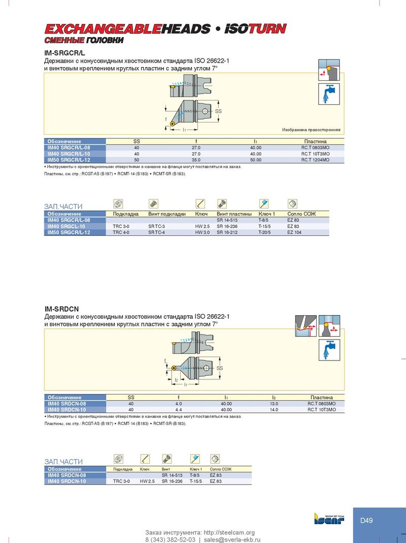 l СМЕННЫЕ ГОЛОВКИ IM-SRGCR/L Державки с конусовидным хвостовиком стандарта ISO 26622-1 и винтовым креплением круглых пластин с задним углом 7° SS f l1 Изображена правосторонняя Обозначение SS f l1 Пластина IM40 SRGCR/L-08 40 27.0 40.00 RC.T 0803MO IM40 SRGCR/L-10 40 27.0 40.00 RC.T 10T3MO IM50 SRGCR/L-12 50 35.0 50.00 RC.T 1204MO • Инструменты с ориентационными отверстиями в канавке на фланце могут поставляться на заказ. Пластины, см. стр.: RCGT‑AS (B197) • RCMT‑14 (B183) • RCMT‑SR (B183). ЗАП.ЧАСТИ Обозначение Подкладка Винт подкладки Ключ Винт пластины Ключ 1 Сопло СОЖ IM40 SRGCR/L-08 SR 14-513 T-8/5 EZ 83 IM40 SRGCL-10 TRC 3-0 SR TC-3 HW 2.5 SR 16-236 T-15/5 EZ 83 IM50 SRGCR/L-12 TRC 4-0 SR TC-4 HW 3.0 SR 16-212 T-20/5 EZ 104 IM-SRDCN Державки с конусовидным хвостовиком стандарта ISO 26622-1 и винтовым креплением круглых пластин с задним углом 7° f SS l2 l1 Обозначение SS f l1 l2 Пластина IM40 SRDCN-08 40 4.0 40.00 13.0 RC.T 0803MO IM40 SRDCN-10 40 4.4 40.00 14.0 RC.T 10T3MO • Инструменты с ориентационными отверстиями в канавке на фланце могут поставляться на заказ. Пластины, см. стр.: RCGT‑AS (B197) • RCMT‑14 (B183) • RCMT‑SR (B183). ЗАП.ЧАСТИ Обозначение Подкладка Ключ Винт Ключ 1 Сопло СОЖ IM40 SRDCN-08 SR 14-513 T-8/5 EZ 83 IM40 SRDCN-10 TRC 3-0 HW 2.5 SR 16-236 T-15/5 EZ 83 D49 Заказ инструмента: http://steelcam.org 8 (343) 382-52-03 | sales@sverla-ekb.ru