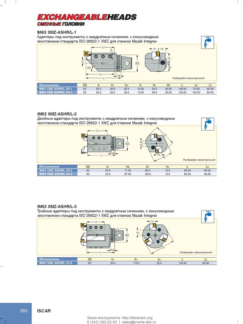 СМЕННЫЕ ГОЛОВКИ IM63 XMZ-ASHR/L-1 Адаптеры под инструменты с квадратным сечением, с конусовидным хвостовиком стандарта ISO 26622-1 XMZ для станков Mazak Integrex L2 b h1 h2 h3 f2 SS 45° H5 L5 18 L Изображён левосторонний Обозначение SS b h1 h2 f2 h3 H5 L L5 L2 IM63 XMZ ASHR/L 20-1 63 20.0 20.0 25.0 10.00 30.0 30.00 100.00 75.00 55.00 IM63 XMZ ASHR/L 25-1 63 25.0 25.0 25.0 13.00 38.0 30.00 130.00 105.00 85.00 IM63 XMZ-ASHR/L-2 Двойные адаптеры под инструменты с квадратным сечением, с конусовидным хвостовиком стандарта ISO 26622-1 XMZ для станков Mazak Integrex L2 D1 SS h2 h2 L 18 h1 H5 Изображён левосторонний Обозначение SS h1 H5 D1 h2 L L2 IM63 XMZ ASHR/L 20-2 63 20.0 71.00 80.0 10.0 85.00 60.00 IM63 XMZ ASHR/L 25-2 63 25.0 87.00 100.0 13.0 85.00 60.00 IM63 XMZ-ASHR/L-3 Тройные адаптеры под инструменты с квадратным сечением, с конусовидным хвостовиком стандарта ISO 26622-1 XMZ для станков Mazak Integrex L2 h1 SS h2 D1 L 18 Изображён левосторонний Обозначение SS h1 D1 h2 L L2 IM63 XMZ ASHR/L 25-3 63 25.0 115.0 23.0 125.00 80.00 D50 ISCAR Заказ инструмента: http://steelcam.org 8 (343) 382-52-03 | sales@sverla-ekb.ru