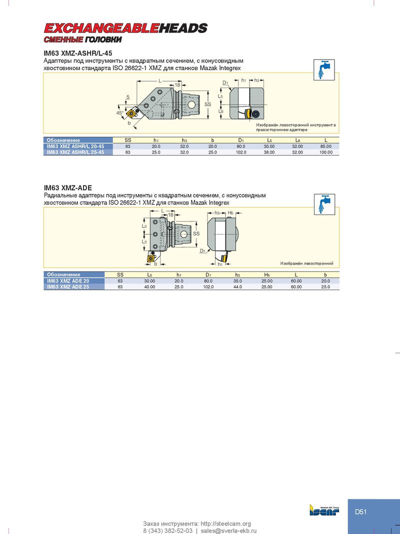 СМЕННЫЕ ГОЛОВКИ IM63 XMZ-ASHR/L-45 Адаптеры под инструменты с квадратным сечением, с конусовидным хвостовиком стандарта ISO 26622-1 XMZ для станков Mazak Integrex L D1 h1 h3 18 5 L5 SS 45° L6 b Изображён левосторонний инструмент в правостороннем адаптере Обозначение SS h1 h3 b D1 L5 L6 L IM63 XMZ ASHR/L 20-45 63 20.0 32.0 20.0 80.0 30.00 32.00 85.00 IM63 XMZ ASHR/L 25-45 63 25.0 32.0 25.0 102.0 38.00 32.00 100.00 IM63 XMZ-ADE Радиальные адаптеры под инструменты с квадратным сечением, с конусовидным хвостовиком стандарта ISO 26622-1 XMZ для станков Mazak Integrex L 18 h3 H5 L5 SS L5 D1 b h1 Изображён левосторонний Обозначение SS L5 h1 D1 h3 H5 L b IM63 XMZ ADE 20 63 30.00 20.0 80.0 35.0 25.00 60.00 20.0 IM63 XMZ ADE 25 63 40.00 25.0 102.0 44.0 25.00 60.00 25.0 D51 Заказ инструмента: http://steelcam.org 8 (343) 382-52-03 | sales@sverla-ekb.ru
