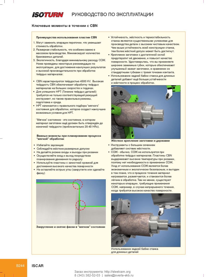 РУКОВОДСТВО ПО ЭКСПЛУАТАЦИИ Ключевые моменты в точении с CBN Преимущества использования пластин CBN • Устойчивость, жёсткость и термостабильность станка являются существенными условиями для 1. Могут заменить операции переточки, что уменьшает производства детали с высоким чистовым качеством. стоимость обработки. Чем выше устойчивость всей конструкции станка, 2. Размерная стабильность, что особенно важно в тем более жёсткий допуск может быть достигнут. массовом производстве. Минимизирует количество • Крепление заготовки с достаточной силой бракованных деталей. предотвратит её движение, и повысит качество 3. Экологичность, благодаря минимальному расходу СОЖ. поверхности. Удостоверьтесь, что вы применяете Ниже приведены некоторые рекомендации по широкие зажимные губки, которые обеспечивают эксплуатации, для достижения наилучших результатов улучшенный захват заготовки, в сравнении со и высокой производительности при обработке стандартными губками с тремя точками контакта. твёрдых материалов: • Использование задней бабки станка для длинных деталей добавит ещё больше устойчивости • CBN характеризуется твёрдостью 4500 HV. Высокая и жёсткости в процесс обработки. твёрдость CBN обеспечивает обработку твёрдых материалов на больших скоростях и подачах. • Для успешного HPT (Точение твёрдых деталей) требуется не только соответствующий режущий инструмент, но также правильные режимы, подготовка и среда. • HPT начинается с правильного подбора “мягкого” состояния для обработки, которое создаст наилучшие возможные условия для HPT. “Мягкое” состояние - это состояние, в котором материал заготовки ещё должен быть отверждён до конечной твёрдости (приблизительно 20-40 HRc). Важные моменты при планировании процесса “мягкой” обработки Жёсткое крепление заготовки и державки • Избегайте заусенцев • Инструменты с большим сечением • Соблюдайте жёсткие размерные допуски добавляют системе жёсткости. • Не делайте резкие входы и выходы при резании • СОЖ - обычно, СОЖ не используется при • Осуществляйте вход и выход посредством обработке твёрдых материалов. Пластины CBN планирования движения по радиусу выдерживают высокие температуры при резании, • Используйте пластины с зачистной кромкой для поэтому нет необходимости в применении СОЖ. достижения высокого качества поверхности Уход от использования СОЖ является более • Не оставляйте острые углы (закруглите или сделайте экономичным и экологически безопасным, и выгоден фаску) в том плане, что в процессе точения материал нагревается, размягчается, и становится более лёгким в обработке. Тем не менее, существуют некоторые операции, требующие применения СОЖ, например, в случае непрерывного точения, когда требуется высокое качество поверхности. Закругление и снятие фаски в ”мягком” состоянии Использование задней бабки станка для длинных деталей B244 ISCAR Заказ инструмента: http://steelcam.org 8 (343) 382-52-03 | sales@sverla-ekb.ru