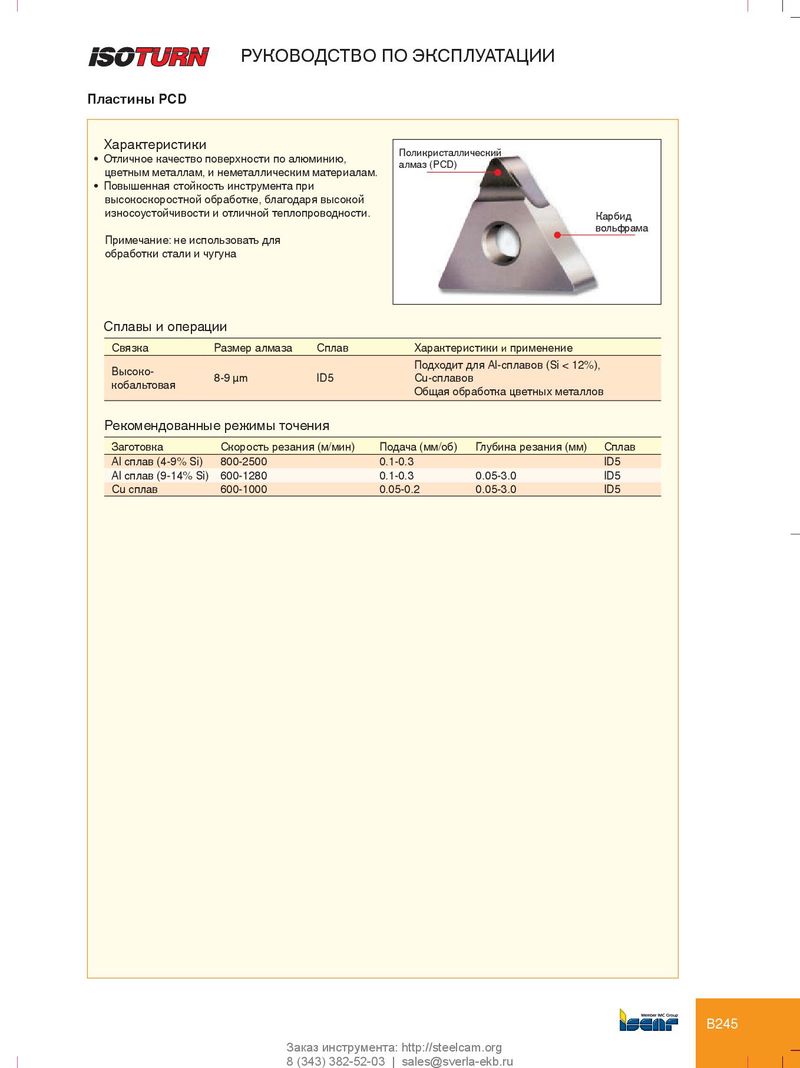 РУКОВОДСТВО ПО ЭКСПЛУАТАЦИИ Пластины PCD Характеристики Поликристаллический • Отличное качество поверхности по алюминию, алмаз (PCD) цветным металлам, и неметаллическим материалам. • Повышенная стойкость инструмента при высокоскоростной обработке, благодаря высокой износоустойчивости и отличной теплопроводности. Карбид вольфрама Примечание: не использовать для обработки стали и чугуна Сплавы и операции Связка Размер алмаза Сплав Характеристики и применение Подходит для Al-сплавов (Si < 12%), Высоко- 8-9 µm ID5 Cu-сплавов кобальтовая Общая обработка цветных металлов Рекомендованные режимы точения Заготовка Скорость резания (м/мин) Подача (мм/об) Глубина резания (мм) Сплав Al сплав (4-9% Si) 800-2500 0.1-0.3 ID5 Al сплав (9-14% Si) 600-1280 0.1-0.3 0.05-3.0 ID5 Cu сплав 600-1000 0.05-0.2 0.05-3.0 ID5 B245 Заказ инструмента: http://steelcam.org 8 (343) 382-52-03 | sales@sverla-ekb.ru