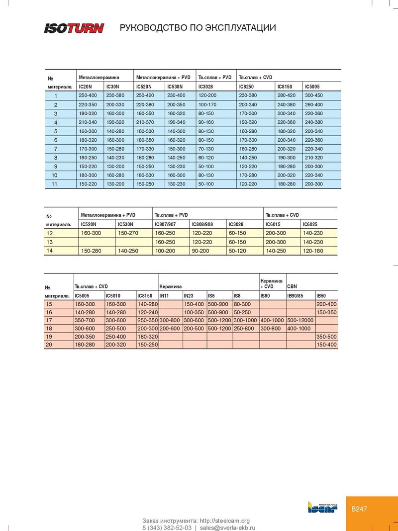 РУКОВОДСТВО ПО ЭКСПЛУАТАЦИИ № Металлокерамика Металлокерамика + PVD Тв.сплав + PVD Тв.сплав + CVD материала. IC20N IC30N IC520N IC530N IC3028 IC8250 IC8150 IC5005 1 250-400 230-380 250-420 230-400 120-200 230-380 280-420 300-450 2 220-350 200-330 220-380 200-350 100-170 200-340 240-380 260-400 3 180-320 160-300 180-350 160-320 80-150 170-300 200-340 220-360 4 210-340 190-320 210-370 190-340 90-160 190-320 220-360 240-380 5 160-300 140-280 160-330 140-300 80-130 160-280 180-320 200-340 6 180-320 160-300 180-350 160-320 80-150 170-300 200-340 220-360 7 170-300 150-280 170-330 150-300 70-130 160-280 200-320 220-340 8 160-250 140-230 160-280 140-250 60-120 140-250 190-300 210-320 9 150-220 130-200 150-250 130-230 50-100 120-220 180-280 200-300 10 180-300 160-280 180-330 160-300 80-130 170-280 200-320 220-340 11 150-220 130-200 150-250 130-230 50-100 120-220 180-280 200-300 № Металлокерамика + PVD Тв.сплав + PVD Тв.сплав + CVD материала. IC520N IC530N IC807/907 IC808/908 IC3028 IC6015 IC6025 12 160-300 150-270 160-250 120-220 60-150 200-300 140-230 13 160-250 120-220 60-150 200-300 140-230 14 150-280 140-250 100-200 90-200 50-120 140-250 120-180 Керамика № Тв.сплав + CVD Керамика + CVD CBN материала. IC5005 IC5010 IC8150 IN11 IN23 IS6 IS8 IS80 IB90/85 IB50 Ферритный/перлитный 180 15 15 160-300 160-300 140-280 150-400 500-900 80-300 200-400 Перлитный 260 16 16 140-280 140-280 120-240 100-350 500-900 50-250 150-350 Ферритный 160 17 17 350-700 300-600 250-350 300-800 300-600 500-1200 300-1000 400-1000 500-12000 K Перлитный 250 18 18 300-600 250-500 200-300 200-600 200-500 500-1200 250-800 300-800 400-1000 Ферритный 130 19 19 200-350 250-400 180-320 350-500 Перлитный 230 20 20 180-280 200-320 150-250 150-400 B247 Заказ инструмента: http://steelcam.org 8 (343) 382-52-03 | sales@sverla-ekb.ru