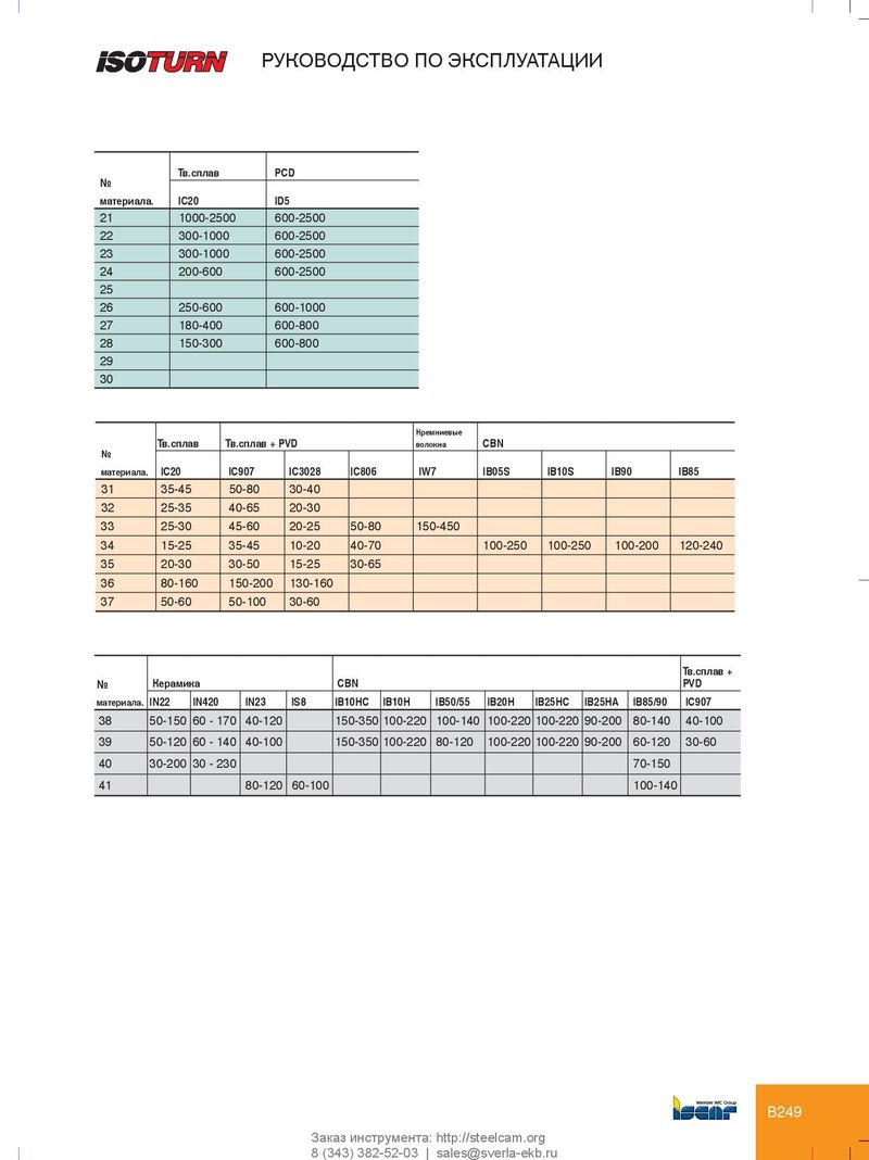 РУКОВОДСТВО ПО ЭКСПЛУАТАЦИИ Тв.сплав PCD № материала. IC20 ID5 21 1000-2500 600-2500 22 300-1000 600-2500 23 300-1000 600-2500 24 200-600 600-2500 25 26 250-600 600-1000 27 180-400 600-800 28 150-300 600-800 29 30 Кремниевые Тв.сплав Тв.сплав + PVD волокна CBN № материала. IC20 IC907 IC3028 IC806 IW7 IB05S IB10S IB90 IB85 31 35-45 50-80 30-40 32 25-35 40-65 20-30 33 25-30 45-60 20-25 50-80 150-450 34 15-25 35-45 10-20 40-70 100-250 100-250 100-200 120-240 35 20-30 30-50 15-25 30-65 36 80-160 150-200 130-160 37 50-60 50-100 30-60 Тв.сплав + № Керамика CBN PVD материала. IN22 IN420 IN23 IS8 IB10HC IB10H IB50/55 IB20H IB25HC IB25HA IB85/90 IC907 38 50-150 60 - 170 40-120 150-350 100-220 100-140 100-220 100-220 90-200 80-140 40-100 39 50-120 60 - 140 40-100 150-350 100-220 80-120 100-220 100-220 90-200 60-120 30-60 40 30-200 30 - 230 70-150 41 80-120 60-100 100-140 B249 Заказ инструмента: http://steelcam.org 8 (343) 382-52-03 | sales@sverla-ekb.ru