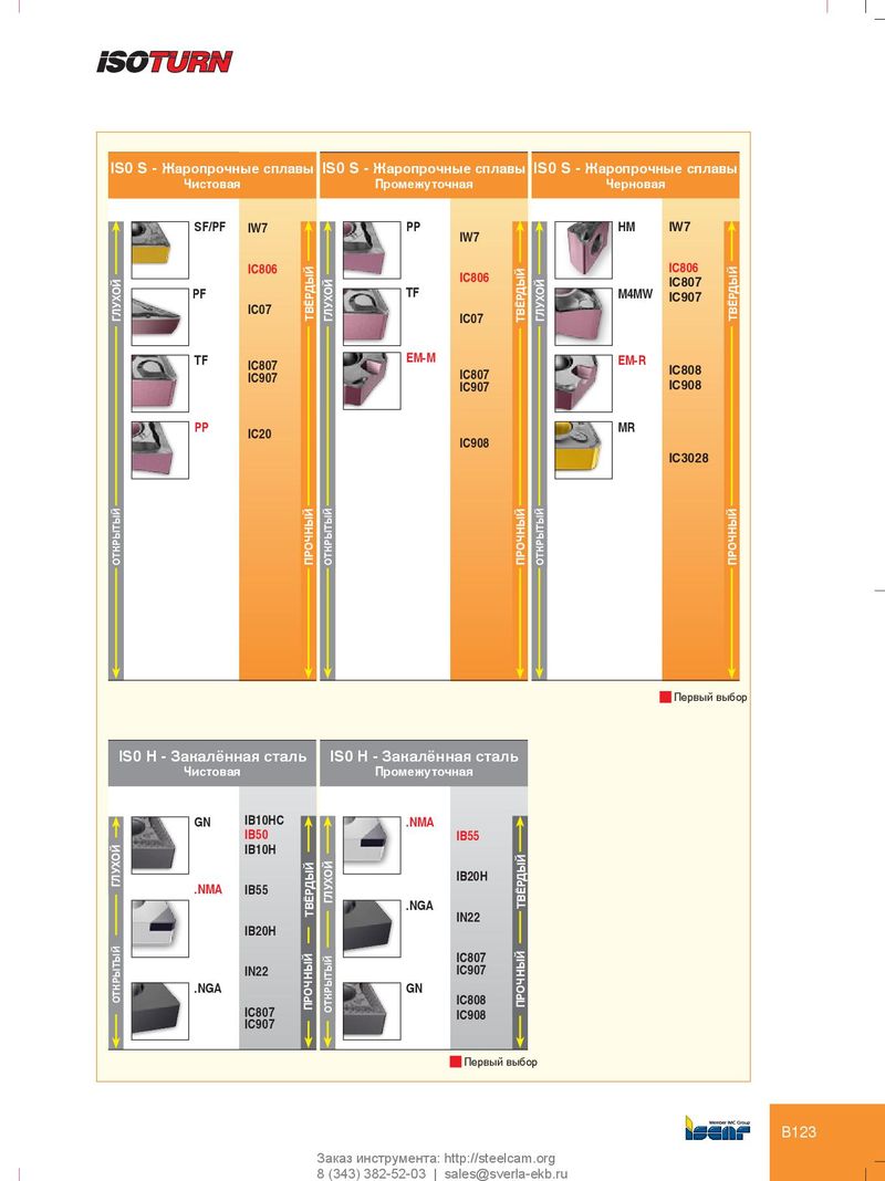 IS0 S - Жаропрочные сплавы IS0 S - High Temp. Alloys IS0 S - Жаропрочные сплавы IS0 S - Жаропрочные сплавы Чистовая Finishing Промежуточная Черновая SF/PF IW7 PP HM IW7 IW7 IC806 IC806 IC806 IC807 PF TF M4MW IC907 IC07 ГЛУХОЙ ТВЁРДЫЙ ГЛУХОЙ IC07 ТВЁРДЫЙ ГЛУХОЙ ТВЁРДЫЙ TF EM-M EM-R IC807 IC808 IC907 IC807 IC907 IC908 PP MR IC20 IC908 IC3028 ОТКРЫТЫЙ ПРОЧНЫЙ ОТКРЫТЫЙ ПРОЧНЫЙ ОТКРЫТЫЙ ПРОЧНЫЙ Первый выбор IS0 H - Закалённая сталь IS0 H - Закалённая сталь Чистовая Промежуточная GN IB10HC .NMA IB50 IB55 IB10H IB20H ГЛУХОЙ .NMA IB55 ГЛУХОЙ .NGA ТВЁРДЫЙ ТВЁРДЫЙ IN22 IB20H IC807 IN22 IC907 .NGA GN ОТКРЫТЫЙ IC808 ПРОЧНЫЙ ПРОЧНЫЙ IC807 ОТКРЫТЫЙ IC908 IC907 Первый выбор B123 Заказ инструмента: http://steelcam.org 8 (343) 382-52-03 | sales@sverla-ekb.ru