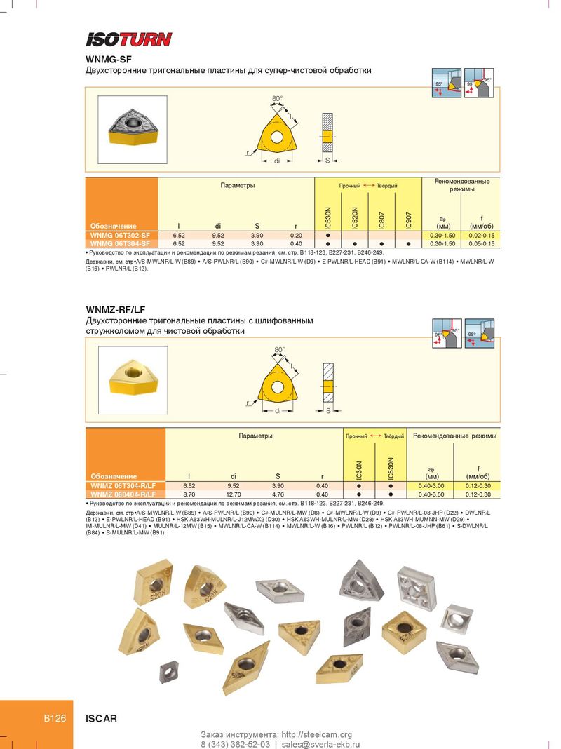 WNMG-SF Двухсторонние тригональные пластины для супер-чистовой обработки 95° 95º 95° 80° l r di S Рекомендованные Параметры Прочный Ö Твёрдый режимы a p f Обозначение l di S r IC530N IC520N IC807 IC907 (мм) (мм/об) WNMG 06T302-SF 6.52 9.52 3.90 0.20 l 0.30-1.50 0.02-0.15 WNMG 06T304-SF 6.52 9.52 3.90 0.40 l l l l 0.30-1.50 0.05-0.15 • Руководство по эксплуатации и рекомендации по режимам резания, см. стр. B118-123, B227-231, B246-249. Державки, см. стр•A/S-MWLNR/L-W (B89) • A/S-PWLNR/L (B90) • C#-MWLNR/L-W (D9) • E-PWLNR/L-HEAD (B91) • MWLNR/L-CA-W (B114) • MWLNR/L-W (B16) • PWLNR/L (B12). WNMZ-RF/LF Двухсторонние тригональные пластины с шлифованным стружколомом для чистовой обработки 95° 95° 95º 80° l r di S Параметры Прочный Ö Твёрдый Рекомендованные режимы a p f Обозначение l di S r IC30N IC530N (мм) (мм/об) WNMZ 06T304-R/LF 6.52 9.52 3.90 0.40 l l 0.40-3.00 0.12-0.30 WNMZ 080404-R/LF 8.70 12.70 4.76 0.40 l l 0.40-3.50 0.12-0.30 • Руководство по эксплуатации и рекомендации по режимам резания, см. стр. B118-123, B227-231, B246-249. Державки, см. стр•A/S-MWLNR/L-W (B89) • A/S-PWLNR/L (B90) • C#-MULNR/L-MW (D8) • C#-MWLNR/L-W (D9) • C#-PWLNR/L-08-JHP (D22) • DWLNR/L (B13) • E-PWLNR/L-HEAD (B91) • HSK A63WH-MULNR/L-J12MWX2 (D30) • HSK A63WH-MULNR/L-MW (D28) • HSK A63WH-MUMNN-MW (D29) • IM-MULNR/L-MW (D41) • MULNR/L-12MW (B15) • MWLNR/L-CA-W (B114) • MWLNR/L-W (B16) • PWLNR/L (B12) • PWLNR/L-08-JHP (B61) • S-DWLNR/L (B84) • S-MULNR/L-MW (B91). B126 ISCAR Заказ инструмента: http://steelcam.org 8 (343) 382-52-03 | sales@sverla-ekb.ru