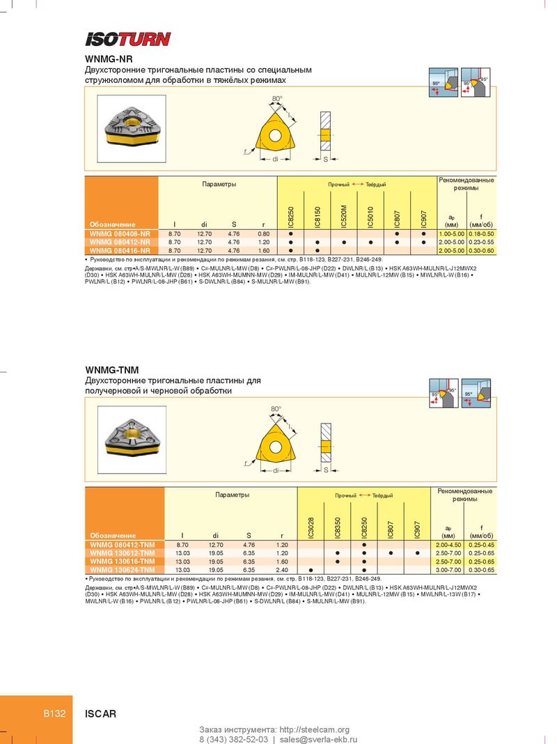 WNMG-NR Двухсторонние тригональные пластины со специальным стружколомом для обработки в тяжёлых режимах 95° 95º 95° 80° l r di S Рекомендованные Параметры Прочный Ö Твёрдый режимы a p f Обозначение l di S r IC8250 IC8150 IC520M IC5010 IC807 IC907 (мм) (мм/об) WNMG 080408-NR 8.70 12.70 4.76 0.80 l l l 1.00-5.00 0.18-0.50 WNMG 080412-NR 8.70 12.70 4.76 1.20 l l l l l l 2.00-5.00 0.23-0.55 WNMG 080416-NR 8.70 12.70 4.76 1.60 l l 2.00-5.00 0.30-0.60 • Руководство по эксплуатации и рекомендации по режимам резания, см. стр. B118-123, B227-231, B246-249. Державки, см. стр•A/S-MWLNR/L-W (B89) • C#-MULNR/L-MW (D8) • C#-PWLNR/L-08-JHP (D22) • DWLNR/L (B13) • HSK A63WH-MULNR/L-J12MWX2 (D30) • HSK A63WH-MULNR/L-MW (D28) • HSK A63WH-MUMNN-MW (D29) • IM-MULNR/L-MW (D41) • MULNR/L-12MW (B15) • MWLNR/L-W (B16) • PWLNR/L (B12) • PWLNR/L-08-JHP (B61) • S-DWLNR/L (B84) • S-MULNR/L-MW (B91). WNMG-TNM Двухсторонние тригональные пластины для получерновой и черновой обработки 95° 95° 95º 80° l r di S Рекомендованные Параметры Прочный Ö Твёрдый режимы a p f Обозначение l di S r IC3028 IC8350 IC8250 IC807 IC907 (мм) (мм/об) WNMG 080412-TNM 8.70 12.70 4.76 1.20 l 2.00-4.50 0.25-0.45 WNMG 130612-TNM 13.03 19.05 6.35 1.20 l l l l 2.50-7.00 0.25-0.65 WNMG 130616-TNM 13.03 19.05 6.35 1.60 l l 2.50-7.00 0.25-0.65 WNMG 130624-TNM 13.03 19.05 6.35 2.40 l l 3.00-7.00 0.30-0.65 • Руководство по эксплуатации и рекомендации по режимам резания, см. стр. B118-123, B227-231, B246-249. Державки, см. стр•A/S-MWLNR/L-W (B89) • C#-MULNR/L-MW (D8) • C#-PWLNR/L-08-JHP (D22) • DWLNR/L (B13) • HSK A63WH-MULNR/L-J12MWX2 (D30) • HSK A63WH-MULNR/L-MW (D28) • HSK A63WH-MUMNN-MW (D29) • IM-MULNR/L-MW (D41) • MULNR/L-12MW (B15) • MWLNR/L-13W (B17) • MWLNR/L-W (B16) • PWLNR/L (B12) • PWLNR/L-08-JHP (B61) • S-DWLNR/L (B84) • S-MULNR/L-MW (B91). B132 ISCAR Заказ инструмента: http://steelcam.org 8 (343) 382-52-03 | sales@sverla-ekb.ru