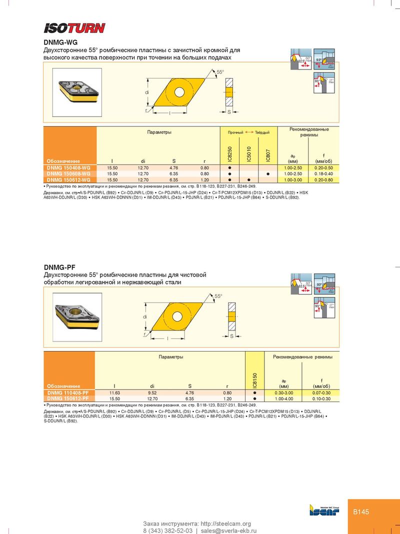 DNMG-WG Двухсторонние 55° ромбические пластины с зачистной кромкой для высокого качества поверхности при точении на больших подачах 60° 62.5° max 93º 30º max 55° 93° 27° max di r l S Рекомендованные Параметры Прочный Ö Твёрдый режимы a p f Обозначение l di S r IC8250 IC5010 IC807 (мм) (мм/об) DNMG 150408-WG 15.50 12.70 4.76 0.80 l 1.00-2.50 0.20-0.50 DNMG 150608-WG 15.50 12.70 6.35 0.80 l l 1.00-2.50 0.18-0.40 DNMG 150612-WG 15.50 12.70 6.35 1.20 l l 1.00-3.00 0.20-0.80 • Руководство по эксплуатации и рекомендации по режимам резания, см. стр. B118-123, B227-231, B246-249. Державки, см. стр•A/S-PDUNR/L (B92) • C#-DDJNR/L (D9) • C#-PDJNR/L-15-JHP (D24) • C#-T-PCM12XPDM15 (D13) • DDJNR/L (B22) • HSK A63WH-DDJNR/L (D30) • HSK A63WH-DDNNN (D31) • IM-DDJNR/L (D43) • PDJNR/L (B21) • PDJNR/L-15-JHP (B64) • S-DDUNR/L (B92). DNMG-PF Двухсторонние 55° ромбические пластины для чистовой обработки легированной и нержавеющей стали 60° 62.5° max 93º 30º max 55° 93° 27° max di r S l Параметры Рекомендованные режимы a p f Обозначение l di S r IC8150 (мм) (мм/об) DNMG 110408-PF 11.63 9.52 4.76 0.80 l 0.30-3.00 0.07-0.30 DNMG 150612-PF 15.50 12.70 6.35 1.20 l 1.00-4.00 0.10-0.30 • Руководство по эксплуатации и рекомендации по режимам резания, см. стр. B118-123, B227-231, B246-249. Державки, см. стр•A/S-PDUNR/L (B92) • C#-DDJNR/L (D9) • C#-PDJNR/L (D5) • C#-PDJNR/L-15-JHP (D24) • C#-T-PCM12XPDM15 (D13) • DDJNR/L (B22) • HSK A63WH-DDJNR/L (D30) • HSK A63WH-DDNNN (D31) • IM-DDJNR/L (D43) • IM-PDJNR/L (D43) • PDJNR/L (B21) • PDJNR/L-15-JHP (B64) • S-DDUNR/L (B92). B145 Заказ инструмента: http://steelcam.org 8 (343) 382-52-03 | sales@sverla-ekb.ru