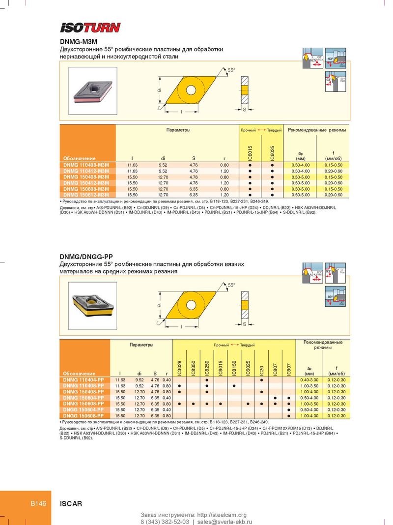 DNMG-M3M Двухсторонние 55° ромбические пластины для обработки нержавеющей и низкоуглеродистой стали 60° 62.5° max 93º 30º max 55° 93° 27° max di r S l Параметры Прочный Ö Твёрдый Рекомендованные режимы a p f Обозначение l di S r IC6015 IC6025 (мм) (мм/об) DNMG 110408-M3M 11.63 9.52 4.76 0.80 l l 0.50-4.00 0.15-0.50 DNMG 110412-M3M 11.63 9.52 4.76 1.20 l l 0.50-4.00 0.20-0.60 DNMG 150408-M3M 15.50 12.70 4.76 0.80 l l 0.50-5.00 0.15-0.50 DNMG 150412-M3M 15.50 12.70 4.76 1.20 l l 0.50-5.00 0.20-0.60 DNMG 150608-M3M 15.50 12.70 6.35 0.80 l l 0.50-5.00 0.15-0.50 DNMG 150612-M3M 15.50 12.70 6.35 1.20 l l 0.50-5.00 0.20-0.60 • Руководство по эксплуатации и рекомендации по режимам резания, см. стр. B118-123, B227-231, B246-249. Державки, см. стр• A/S-PDUNR/L (B92) • C#-DDJNR/L (D9) • C#-PDJNR/L (D5) • C#-PDJNR/L-15-JHP (D24) • DDJNR/L (B22) • HSK A63WH-DDJNR/L (D30) • HSK A63WH-DDNNN (D31) • IM-DDJNR/L (D43) • IM-PDJNR/L (D43) • PDJNR/L (B21) • PDJNR/L-15-JHP (B64) • S-DDUNR/L (B92). DNMG/DNGG-PP Двухсторонние 55° ромбические пластины для обработки вязких материалов на средних режимах резания 60° 93° 27° max 62.5° max 55° 93º 30º max di r S l Рекомендованные Параметры Прочный Ö Твёрдый режимы a p f Обозначение l di S r IC3028 IC8350 IC8250 IC6015 IC8150 IC6025 IC20 IC807 IC907 (мм) (мм/об) DNMG 110404-PP 11.63 9.52 4.76 0.40 l l 0.40-3.00 0.12-0.30 DNMG 110408-PP 11.63 9.52 4.76 0.80 l l l 1.00-3.50 0.12-0.30 DNMG 150408-PP 15.50 12.70 4.76 0.80 l l l 1.00-4.00 0.12-0.30 DNMG 150604-PP 15.50 12.70 6.35 0.40 l l 0.50-4.00 0.12-0.30 DNMG 150608-PP 15.50 12.70 6.35 0.80 l l l l l l l l 1.00-3.50 0.12-0.30 DNGG 150604-PP 15.50 12.70 6.35 0.40 l 0.50-4.00 0.12-0.30 DNGG 150608-PP 15.50 12.70 6.35 0.80 l 1.00-4.00 0.12-0.30 • Руководство по эксплуатации и рекомендации по режимам резания, см. стр. B118-123, B227-231, B246-249. Державки, см. стр• A/S-PDUNR/L (B92) • C#-DDJNR/L (D9) • C#-PDJNR/L (D5) • C#-PDJNR/L-15-JHP (D24) • C#-T-PCM12XPDM15 (D13) • DDJNR/L (B22) • HSK A63WH-DDJNR/L (D30) • HSK A63WH-DDNNN (D31) • IM-DDJNR/L (D43) • IM-PDJNR/L (D43) • PDJNR/L (B21) • PDJNR/L-15-JHP (B64) • S-DDUNR/L (B92). B146 ISCAR Заказ инструмента: http://steelcam.org 8 (343) 382-52-03 | sales@sverla-ekb.ru