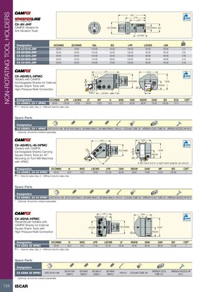 NON-ROTATING TOOL HOLDERS OAL LPR LBX Bar Max C#-AV-JHP CAMFIX Holders for DCONMS DCONWS BD Anti-Vibration Tools LSCWS Designation DCONMS DCONWS OAL BD LPR LSCWS LBX kg C6 AV-D16-JHP 63.00 16.00 143.00 45.00 105.00 55.00 83.00 1.57 C6 AV-D20-JHP 63.00 20.00 143.00 55.00 105.00 80.00 83.00 2.00 C6 AV-D25-JHP 63.00 25.00 143.00 55.00 105.00 80.00 83.00 1.89 C6 AV-D32-JHP 63.00 32.00 143.00 65.00 105.00 85.00 66.60 2.23 C6 AV-D40-JHP 63.00 40.00 143.00 75.00 105.00 85.00 64.00 2.49 LPR OAH C#-ASHR/L-HPMC ECA Bar Max Holders with CAMFIX Exchangeable Shanks for External WF DCONMS OAW Square Shank Tools with RADWBD High-Pressure Multi-Connection WSC LSCWS LF H Designation DCONMS LPR LSCWS LF WF H WSC OAH RADW OAW BD ECA CDI(1) C6 ASHR/L 25-1 HPMC 63.00 120.00 70.00 30.00 13.00 25.0 25.0 82.00 38.00 70.00 100.00 27.0 1 (1) 1 - Hole for data chip, 0 - Without hole for data chip Spare Parts Designation C6 ASHR/L 25-1 HPMC SATZ-M12X1-M6 SR M12X30 DIN915 SR M8X6 DIN913 SR M6X6 DIN913 HW 6.0* COOLING TUBE C6* WRENCH COOL TUBE C6* WRENCH NOZZLE HP M12* * Optional, should be ordered separately LPR OAHH C#-ASHR/L-45-HPMC Bar Max Holders with CAMFIXExchangeable Shanks Carrying WSC DCONMS WF OAW Square Shank Tools for 45° RADW Mounting on Turn-Mill Machineswith HPMC LSCWS BD A left-hand tool in a right-hand adapter are shown Designation DCONMS H WSC LSCWS LPR OAH RADW OAW WF BD CDI(1) C6 ASHR/L 25-45 HPMC 63.00 25.0 25.0 70.00 101.30 83.00 38.00 79.60 15.00 100.00 1 (1) 1 - Hole for data chip, 0 - Without hole for data chip Spare Parts Designation C6 ASHR/L 25-45 HPMC SATZ-M10X1-M5 SR M12X30 DIN915 SR M8X6 DIN913 SR M6X6 DIN913 HW 6.0* COOLING TUBE C6* WRENCH COOL TUBE C6* WRENCH NOZZLE HP M10* * Optional, should be ordered separately LPR OAH WSC LF H C#-ASHA-HPMC Bar Max Perpendicular Holders with CAMFIX Shanks for External Square Shank Tools with LSCWS DCONMS OAW High-Pressure Multi-Connection DB RADW Designation DCONMS H WSC LPR LSCWS LF RADW OAW OAH BD CDI(1) C6 ASHA 25 HPMC 63.00 25.0 25.0 71.00 61.20 46.00 45.00 90.00 86.50 110.00 1 (1) 1 - Hole for data chip, 0 - Without hole for data chip Spare Parts Designation C6 ASHA 25 HPMC SATZ-M12X1-M6 SR M12X30 SR M8X6 SR M8X10DIN915DIN913DIN913SR M6X6DIN913HW 6.0*COOLING TUBE C6*WRENCH COOLTUBE C6*WRENCH NOZZLE HPM12* * Optional, should be ordered separately 734 ISCAR
