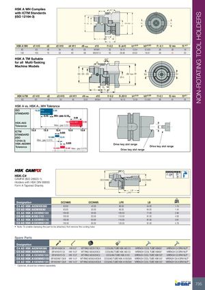 NON-ROTATING TOOL HOLDERS HSK A WH Complies l5 60° with ICTM Standards (ISO 12164-3) d2 d4 d3 d9 max. d1 b5 b1 d15 f3 l1 f1 f2 HSK-A WH d1 h10 d2 d3 H10 d4 H11 d9 max d15 l1-0.2 l5 Js10 b1±0.04 b5±0.035 f1 -0.1 f2 min f3 ±0.1 63 63 48 34 40 62 M18X1 32 18.13 12.54 12.425 26 30 18 100 100 75 53 63 99 M24X1.5 50 28.56 20.02 19.91 29 34 20 HSK A TM Suitable 60˚ for all Multi-Tasking l5 Machine Models d2 d4 d3 d9 max d1 b5 b1 d15 f3 l1 f1 f2 HSK A-TM d1 h10 d2 d3 H10 d4 H11 d9 max d15 l1-0.2 l5 JS10 b1±0.04 b5±0.035 f1-0.1 f2 min f3±0.1 63 63 48 34 40 52.8 M18x1 32 18.13 12.54 12.425 26 42 18 HSK A vs. HSK A...WH Tolerance ISO key STANDARD tolerance HSK-A63 key slot Tolerance Max. gap 0.33 tolerance ICTM STANDARD (ISO 12164-3) Max. gap 0.015 HSK-A63WH Drive key slot range Tolerance Drive key slot rangeMax. gap 0.075Drive key slot range A 0.003 A 58-60 HRc HSK-C# CAMFIX (ISO 26623-1) DCONMS DCONWS Holders with HSK DIN 69893 Form A Tapered Shanks LB LPR Designation DCONMS DCONWS LPR LB kg C4 AD HSK A63WHX080 63.00 40.00 80.00 54.00 1.10 C5 AD HSK A63WHX90 63.00 50.00 90.00 64.00 1.44 C5 AD HSK A100WHX100 100.00 50.00 100.00 71.00 2.90 C6 AD HSK A100-110 100.00 63.00 110.00 81.00 4.00 C6 AD HSK A100WHX110 100.00 63.00 110.00 81.00 3.61 C8 AD HSK A100WHX120 100.00 80.00 120.00 91.00 4.79 • Note: To enable clamping the part to be attached, first remove the cooling tube Spare Parts Designation C4 AD HSK A63WHX080 SR M14X58 C4 HW 8.0* MT RING M22X17XC4 COOLING TUBE HSK A63 C5 WRENCH COOL TUBE HSK63* WRENCH C4 DRW NUT* C5 AD HSK A63WHX90 SR M16X70 C5 HW 10.0* MT RING M25X20XC5 COOLING TUBE HSK A63 C5 WRENCH COOL TUBE HSK63* WRENCH C5 DRW NUT* C5 AD HSK A100WHX100 SR M16X70 C5 HW 10.0* MT RING M25X20XC5 COOLING TUBE HSK A100 WRENCH COOL TUBE HSK100* WRENCH C5 DRW NUT* C6 AD HSK A100WHX110 SR M20X87 C6/8 HW 14.0* MT RING M30X24XC6/8 COOLING TUBE HSK A100C6/8 WRENCH COOL TUBE HSK100* WRENCH C6-8 DRW NUT* C8 AD HSK A100WHX120 SR M20X87 C6/8 HW 14.0* MT RING M30X24XC6/8 COOLING TUBE HSK A100C6/8 WRENCH COOL TUBE HSK100* WRENCH C6-8 DRW NUT* * Optional, should be ordered separately 735