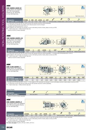 NON-ROTATING TOOL HOLDERS HSK A63WH-ASHN-45 LPR45°L5 90H Square Shank Tool Adapters 35 Bar Max with HSK Exchangeable DCONMS Shanks for 45° Mounting 70 on Turn-Mill Machines LSCWS WSC 50 Right-hand shown Designation DCONMS H WSC LPR LSCWS L5 CDI(2) HSK A63WH ASHN 25 45 (1) 63.00 25.0 25.0 121.00 72.00 42.00 1 SR M10X25 DIN912 SR M8X20 DIN916 SATZ-M12X1-M6 WRENCH NOZZLE HP M12* • A cooling tube must be used with all coolant through HSK spindles (should be ordered separately) • For using left-hand toolholder, the position of the clamping spacer must be changed • Complies with ICTM standard (ISO 12164-3) (1) Not suitable for ATC (automatic tool changer) on some multi-tasking machine models, please consult your MTB (2) 1 - Hole for data chip, 0 - Without hole for data chip * Optional, should be ordered separately HSK A63WH-ASHR/L-45Square Shank Tool Adapters LPR H 33L5 Bar Max with HSK-T Exchangeable LSCWS 38 Shanks for 45° Mountingon Turn-Mill Machines DCONMS 1545°41.6 100 A left-hand tool in a right-hand adapter are shown Designation DCONMS H LPR LSCWS L5 CDI(2) HSK A63WH ASHR/L 25 45 (1) 63.00 25.0 110.00 70.00 30.00 1 SR M12X30 DIN915 SATZ-M10X1-M5 WRENCH NOZZLE HP M10* • A cooling tube must be used with all coolant through HSK spindles (should be ordered separately) • Complies with ICTM standard (ISO 12164-3) (1) Not suitable for ATC (automatic tool changer) on some multi-tasking machine models, please consult your MTB (2) 1 - Hole for data chip, 0 - Without hole for data chip * Optional, should be ordered separately HSK A-WH-ASHR/L-1 WSC LSCWS LF BD H Bar Max Square Shank Tool Adapters RADW with HSK Exchangeable Shanks WF DCONMS OAW for Turn-Mill Machines 27° LPR L5 OAH Left-hand shown Designation DCONMS H WSC WF LPR LSCWS LF L5 OAH RADW OAW BD CDI(1) HSK A63WH ASHR/L 25 1 63.00 25.0 25.0 13.00 125.00 70.00 35.00 30.00 82.00 38.0 70.00 100.00 1 HSK A100WH ASHR/L 32 1 100.00 32.0 32.0 8.00 145.00 90.00 45.00 38.00 85.00 40.0 84.00 100.00 1 • Complies with ICTM standard (ISO 12164-3) • Not suitable for ATC (automatic tool changer) on some multi-tasking machine models, please consult your MTB • A cooling tube must be used with all coolant through HSK spindles (should be ordered separately) (1) 1 - Hole for data chip, 0 - Without hole for data chip Spare Parts Designation HSK A-WH-ASHR/L-1 SR M12X30 DIN915 HW 6.0* SATZ-M12X1-M6 WRENCH NOZZLE HP M12* * Optional, should be ordered separately HSK A63WH-ASHR/L-2 WSC LSCWS Twin Square Shank Tool Adapters 13 100 Bar Max with HSK Exchangeable Shanks DCONMS for Turn-Mill Machines L5 13 H LPR 77.4 Left-hand shown Designation DCONMS H WSC LPR LSCWS L5 CDI(2) HSK A63WH ASHR/L 25 2 (1) 63.00 25.0 25.0 125.00 95.00 30.00 1 SR M12X30 DIN915 SATZ-M12X1-M6 WRENCH NOZZLE HP M12* • Complies with ICTM standard (ISO 12164-3) • A cooling tube must be used with all coolant through HSK spindles (should be ordered separately) (1) Not suitable for ATC (automatic tool changer) on some multi-tasking machine models, please consult your MTB (2) 1 - Hole for data chip, 0 - Without hole for data chip * Optional, should be ordered separately For tools, see pages: PCLXR/L-JHP (52) • SER/L-JHP (701) 736 ISCAR