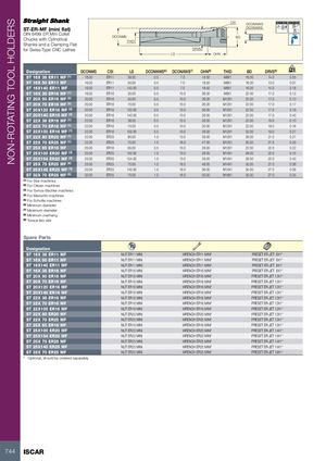NON-ROTATING TOOL HOLDERS CSI DCONNWS A 0.005 A 58-60 HRc ST-ER-MF (mini flat) DCONXWS DIN 6499 ER Mini Collet DCONMSChucks with CylindricalTHID BD Shanks and a Clamping Flat for Swiss-Type CNC Lathes DRVS LS OHN Designation DCONMS CSI LS DCONNWS(6) DCONXWS(7) OHN(8) THID BD DRVS(9) kg ST 16X 38 ER11 MF (1) 16.00 ER11 38.00 0.5 7.0 18.50 M8X1 16.00 14.0 0.05 ST 16X 50 ER11 MF 16.00 ER11 50.00 0.5 7.0 18.50 M8X1 16.00 13.0 0.07 ST 16X140 ER11 MF 16.00 ER11 140.00 0.5 7.0 18.50 M8X1 16.00 14.0 0.18 ST 16X 35 ER16 MF (1) 16.00 ER16 35.00 0.5 10.0 36.00 M8X1 22.00 17.0 0.12 ST 20X 50 ER16 MF (2) 20.00 ER16 50.00 0.5 10.0 26.00 M12X1 22.00 17.0 0.10 ST 20X 70 ER16 MF (2) 20.00 ER16 70.00 0.5 10.0 26.00 M12X1 22.00 17.0 0.17 ST 20X120 ER16 MF (2) 20.00 ER16 120.00 0.5 10.0 26.00 M12X1 22.00 17.0 0.19 ST 20X140 ER16 MF (2) 20.00 ER16 140.00 0.5 10.0 26.00 M12X1 22.00 17.0 0.40 ST 22X 38 ER16 MF (1) 22.00 ER16 38.00 0.5 10.0 26.00 M12X1 22.00 19.0 0.10 ST 22X 70 ER16 MF (1) 22.00 ER16 70.00 0.5 10.0 26.00 M12X1 22.00 19.0 0.16 ST 22X100 ER16 MF (1) 22.00 ER16 100.00 0.5 10.0 28.00 M12X1 22.00 19.0 0.27 ST 22X 80 ER20 MF (1) 22.00 ER20 80.00 1.0 13.0 39.00 M12X1 28.00 21.0 0.21 ST 22X 70 ER25 MF (1) 22.00 ER25 70.00 1.0 16.0 47.00 M12X1 35.00 27.0 0.25 ST 25X 65 ER16 MF 25.00 ER16 65.00 0.5 10.0 28.00 M12X1 22.00 22.0 0.22 ST 25X100 ER20 MF (3) 25.00 ER20 100.00 1.0 13.0 28.00 M14X1 28.00 22.0 0.15 ST 25X154 ER20 MF (3) 25.00 ER20 154.00 1.0 13.0 28.00 M14X1 28.00 22.0 0.40 ST 25X 75 ER25 MF (4) 25.00 ER25 75.00 1.0 16.0 48.00 M14X1 35.00 27.0 0.36 ST 25X145 ER25 MF (3) 25.00 ER25 145.00 1.0 16.0 36.00 M14X1 35.00 27.0 0.08 ST 32X 70 ER25 MF (5) 32.00 ER25 70.00 1.0 16.0 30.00 M18X1 35.00 27.0 0.35 (1) For Star machines (2) For Citizen machines (3) For Tornos-Bechler machines (4) For Manurhin machines (5) For Schutte machines (6) Minimum diameter (7) Maximum diameter (8) Minimum overhang (9) Torque key size Spare Parts Designation ST 16X 38 ER11 MF NUT ER11 MINI WRENCH ER11 MINI* PRESET ER-JET 8X1* ST 16X 50 ER11 MF NUT ER11 MINI WRENCH ER11 MINI* PRESET ER-JET 8X1* ST 16X140 ER11 MF NUT ER11 MINI WRENCH ER11 MINI* PRESET ER-JET 8X1* ST 16X 35 ER16 MF NUT ER16 MINI WRENCH ER16 MINI* PRESET ER-JET 8X1* ST 20X 50 ER16 MF NUT ER16 MINI WRENCH ER16 MINI* PRESET ER-JET 12X1* ST 20X 70 ER16 MF NUT ER16 MINI WRENCH ER16 MINI* PRESET ER-JET 12X1* ST 20X120 ER16 MF NUT ER16 MINI WRENCH ER16 MINI* PRESET ER-JET 12X1* ST 20X140 ER16 MF NUT ER16 MINI WRENCH ER16 MINI* PRESET ER-JET 12X1* ST 22X 38 ER16 MF NUT ER16 MINI WRENCH ER16 MINI* PRESET ER-JET 12X1* ST 22X 70 ER16 MF NUT ER16 MINI WRENCH ER16 MINI* PRESET ER-JET 12X1* ST 22X100 ER16 MF NUT ER16 MINI WRENCH ER16 MINI* PRESET ER-JET 12X1* ST 22X 80 ER20 MF NUT ER20 MINI WRENCH ER20 MINI* PRESET ER-JET 12X1* ST 22X 70 ER25 MF NUT ER25 MINI WRENCH ER25 MINI* PRESET ER-JET 12X1* ST 25X 65 ER16 MF NUT ER16 MINI WRENCH ER16 MINI* PRESET ER-JET 12X1* ST 25X100 ER20 MF NUT ER20 MINI WRENCH ER20 MINI* PRESET ER-JET 14X1* ST 25X154 ER20 MF NUT ER20 MINI WRENCH ER20 MINI* PRESET ER-JET 14X1* ST 25X 75 ER25 MF NUT ER25 MINI WRENCH ER25 MINI* PRESET ER-JET 14X1* ST 25X145 ER25 MF NUT ER25 MINI WRENCH ER25 MINI* PRESET ER-JET 14X1* ST 32X 70 ER25 MF NUT ER25 MINI WRENCH ER25 MINI* PRESET ER-JET 18X1* * Optional, should be ordered separately 744 ISCAR