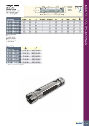 NON-ROTATING TOOL HOLDERS DRVS CSI DRVS CSI DCONNWS A 0.005 A 58-60 HRc ST-ER-MF-D DCONXWS (double-ended) DCONMS BDDouble-Ended Mini Collets BD with Cylindrical Shanks and a Clamping Flat CNDOHNLS OHN Designation DCONMS LS CSI DCONNWS(3) DCONXWS(4) BD CND OHN(5) DRVS(6) kg ST 16X 50 ER11 MF D 16.00 50.00 ER11 0.5 7.0 16.00 7.5 18.50 14.0 0.07 ST 20X 30 ER11 MF D (1) 20.00 30.00 ER11 0.5 7.0 16.00 7.5 18.50 17.0 0.09 ST 20X 50 ER11 MF D (1) 20.00 50.00 ER11 0.5 7.0 16.00 7.5 18.50 17.0 0.13 ST 20X 55 ER16 MF D (1) 20.00 55.00 ER16 0.5 10.0 22.00 10.5 25.00 17.0 0.12 ST 22X 55 ER16 MF D (2) 22.00 55.00 ER16 0.5 10.0 22.00 10.5 28.00 19.0 0.17 ST 22X 75 ER16 MF D (2) 22.00 75.00 ER16 0.5 10.0 22.00 10.5 28.00 19.0 0.21 ST 25X 62 ER16 MF D 25.00 62.00 ER16 0.5 10.0 22.00 10.5 28.00 22.0 0.23 ST 32X 55 ER20 MF D (2) 32.00 55.00 ER20 1.0 13.0 28.00 13.5 28.00 27.0 0.34 ST 32X 75 ER20 MF D (2) 32.00 75.00 ER20 1.0 13.0 28.00 13.5 28.00 27.0 0.44 (1) For Citizen machines (2) For Star machines (3) Minimum diameter (4) Maximum diameter (5) Minimum overhang (6) Torque key size Spare Parts Designation ST 16X 50 ER11 MF D NUT ER11 MINI WRENCH ER11 MINI* ST 20X 30 ER11 MF D NUT ER11 MINI WRENCH ER11 MINI* ST 20X 50 ER11 MF D NUT ER11 MINI WRENCH ER11 MINI* ST 20X 55 ER16 MF D NUT ER16 MINI WRENCH ER16 MINI* ST 22X 55 ER16 MF D NUT ER16 MINI WRENCH ER16 MINI* ST 22X 75 ER16 MF D NUT ER16 MINI WRENCH ER16 MINI* ST 25X 62 ER16 MF D NUT ER16 MINI WRENCH ER16 MINI* ST 32X 55 ER20 MF D NUT ER20 MINI WRENCH ER20 MINI* ST 32X 75 ER20 MF D NUT ER20 MINI WRENCH ER20 MINI* * Optional, should be ordered separately 745